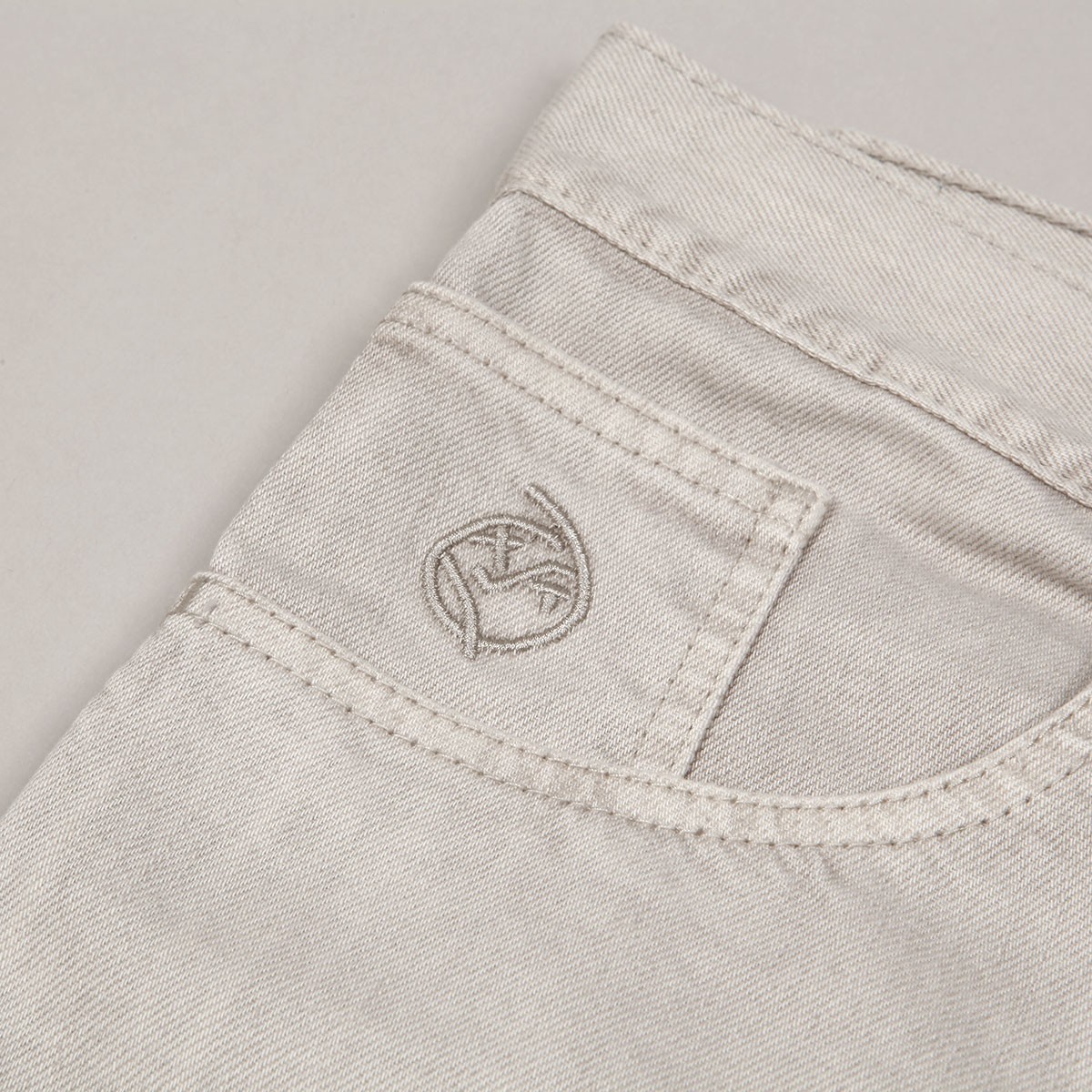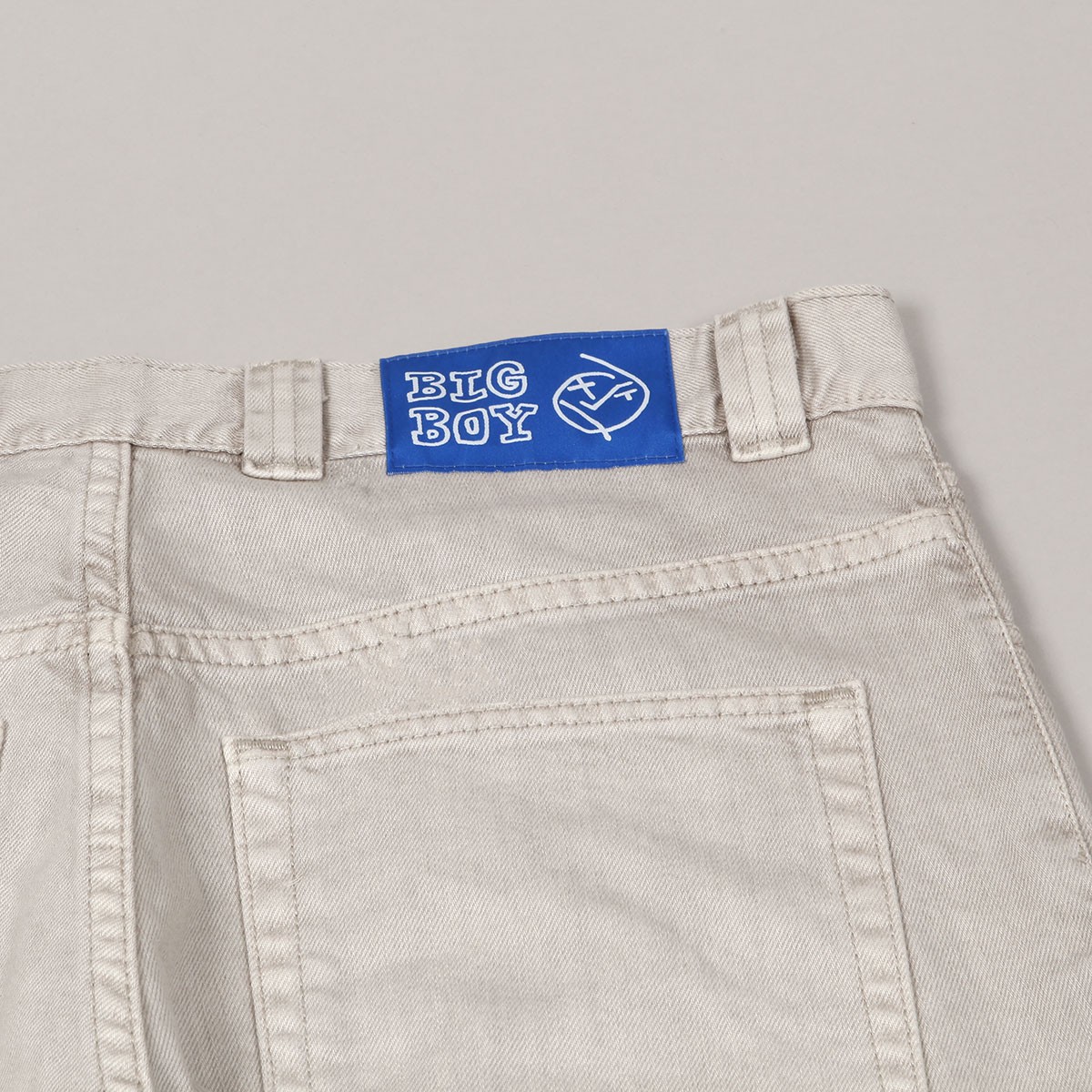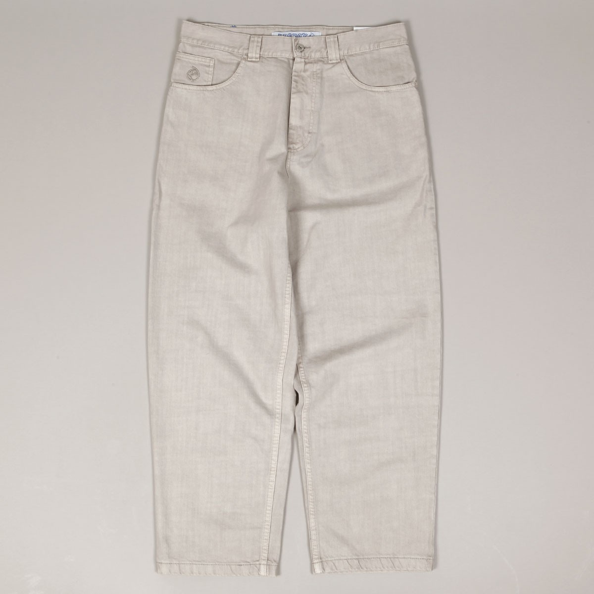 Polar Skate Co. pants called Big Boy Jeans in light gray-beige color. They have a wide retro cut with wide legs. Fastened with a covered zipper and button. In the right pocket there is a smiley face patch. Made of 100% cotton, 435 g. Made in Poland.