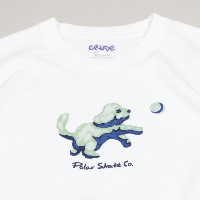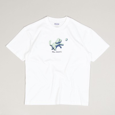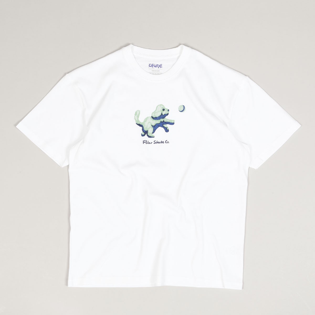 Polar Skate Co. short-sleeved T-shirt called Ball Tee in white. On the chest there is a graphic with a motif of a dog playing with a ball and the inscription Polar Skate Co. Material 100% cotton, 210 g.