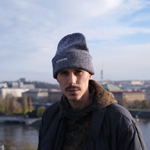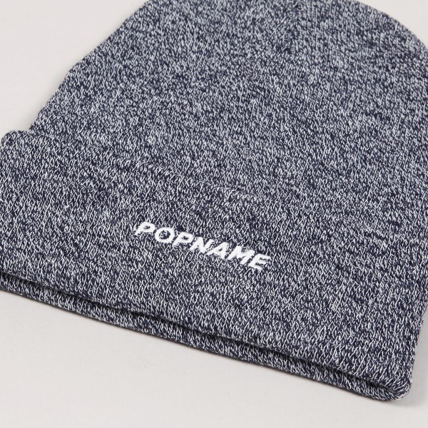POPNAME Cuffed beanie in dark blue brindled color. On the front there is embroidery in white with the POPNAME Basic logo.
