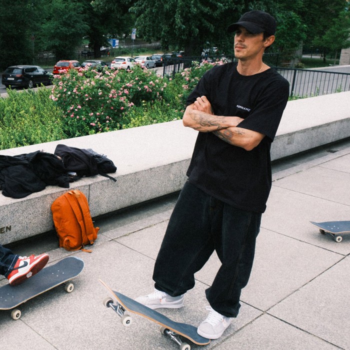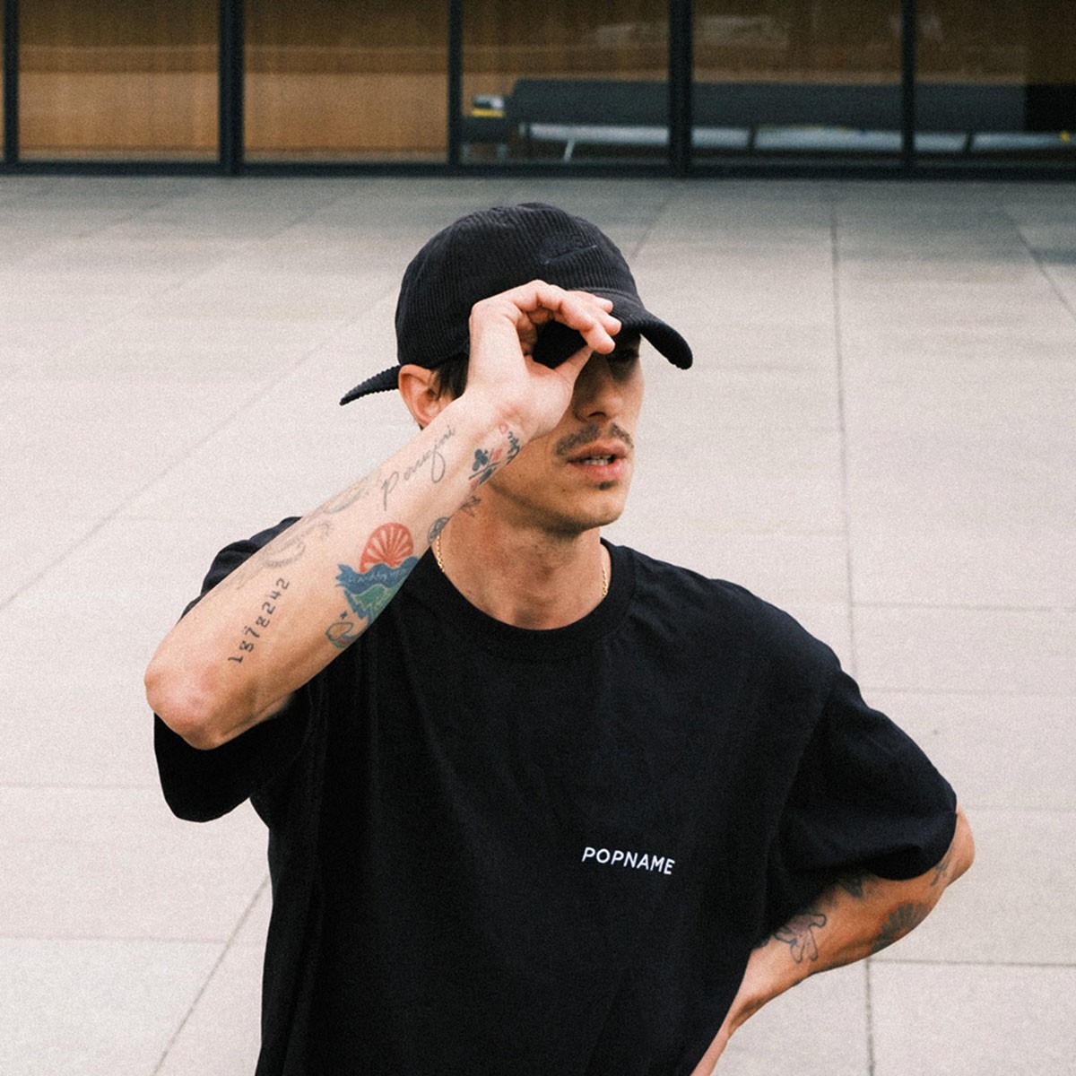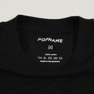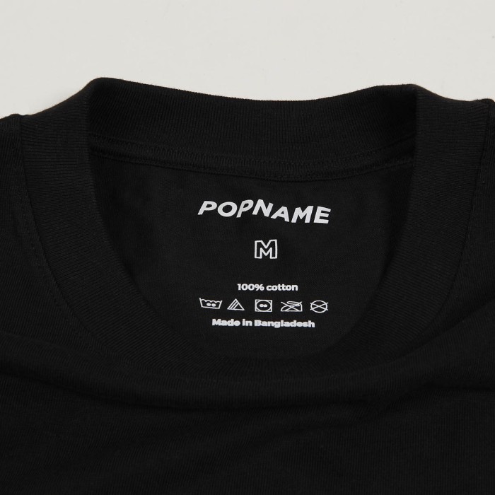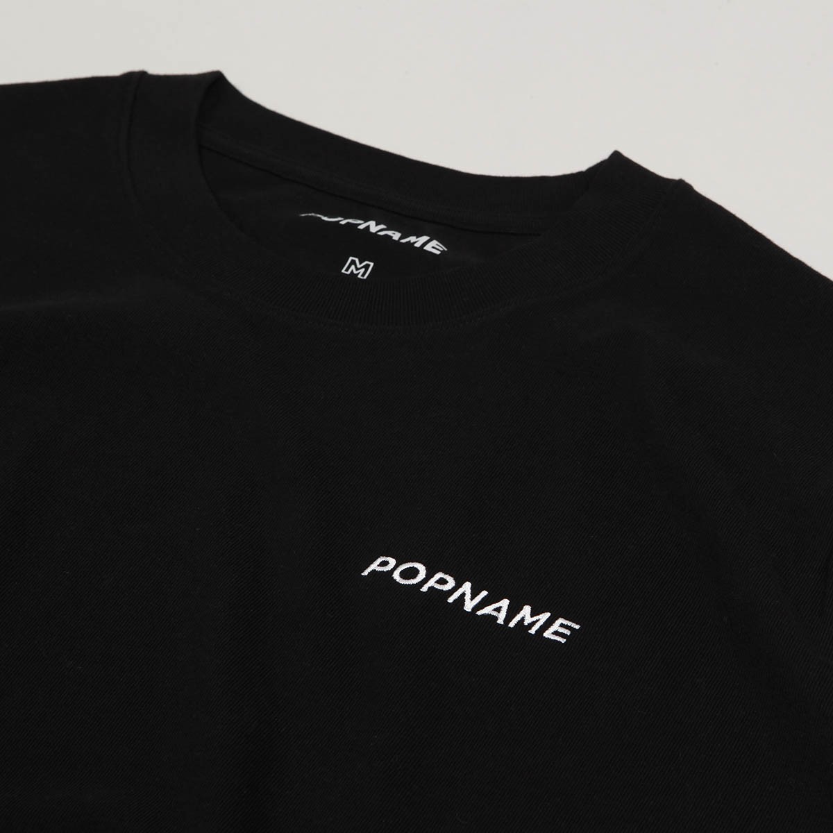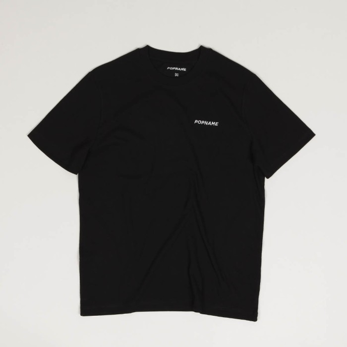 Black T-shirt with short sleeves and an embroidered POPNAME mini logo on the chest.