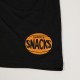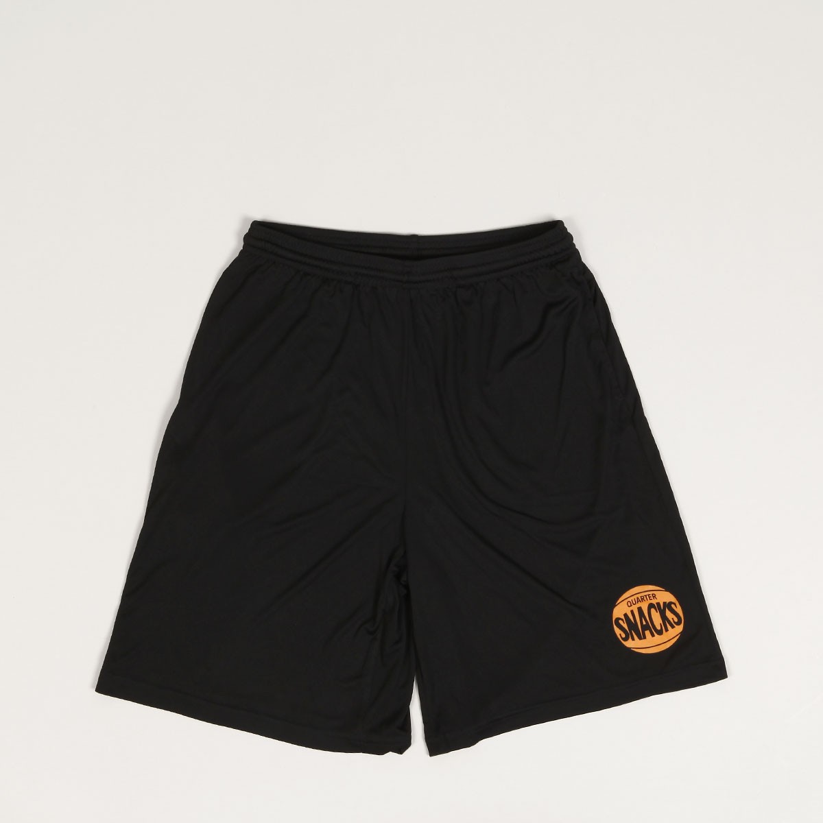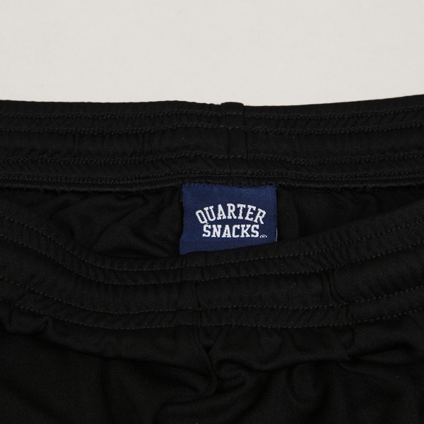 Quartersnacks shorts called 70s Logo Gym Shorts in black. On the left leg, a basketball with the Quartersnacks logo is printed. Elastic waist with a hidden drawstring. Two pockets for small items on the sides. Comfortable, lightweight and stretchy design. Made of 100% cotton.