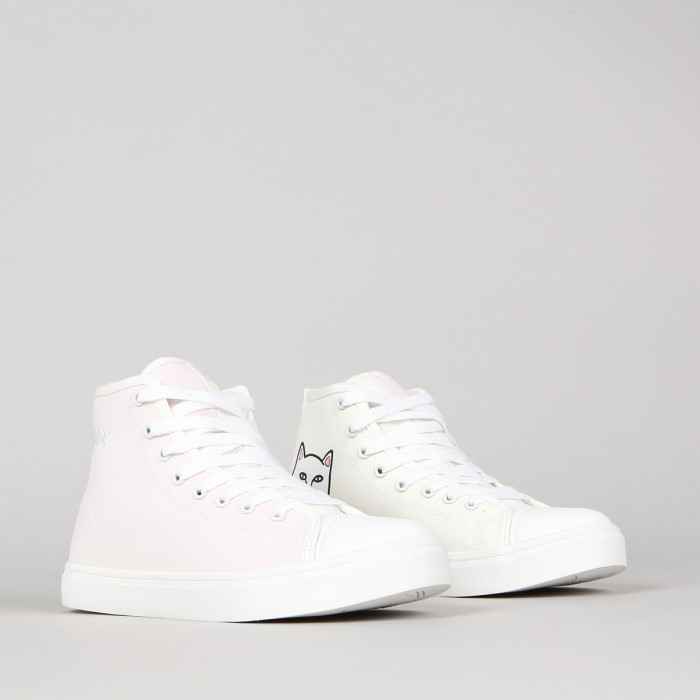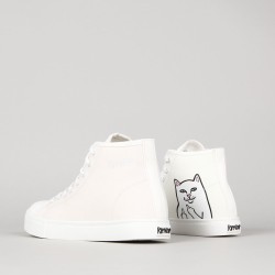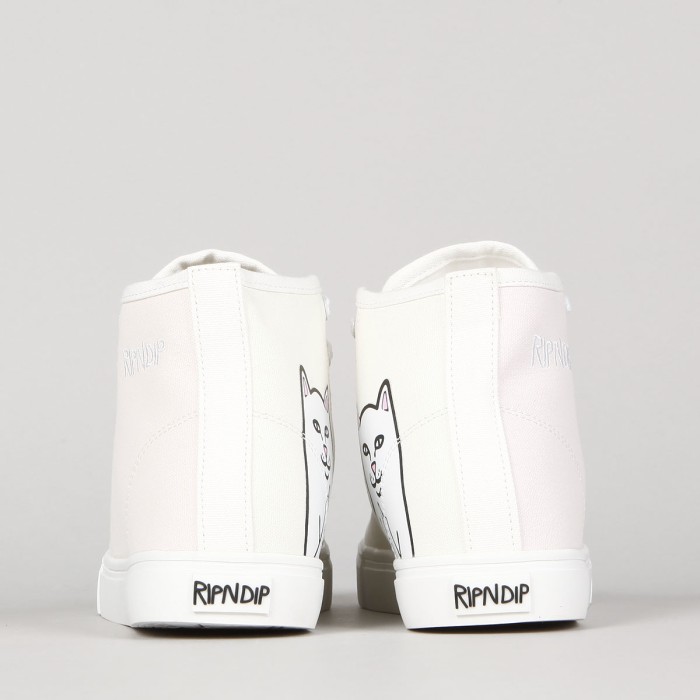 Shoes from the Ripndip collection, model Lord Nermal UV Hi-Top, which changes color when exposed to sunlight. The upper is made of canvas, leather toe, metal eyelets, volcanic sole with leaf and cat graphics, Ripndip logo on the heel and insole. Lord Nermal cat printed on the inside of the shoes and Ripndip inscription embroidered on the outside.