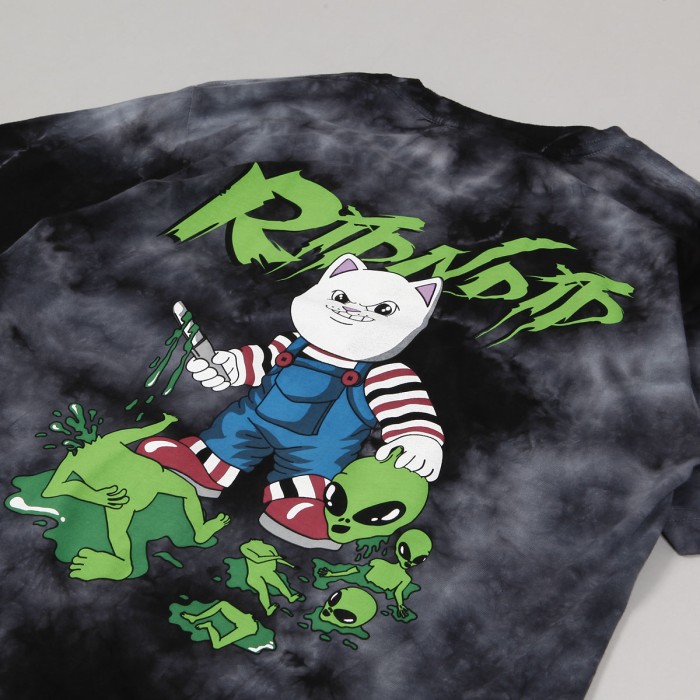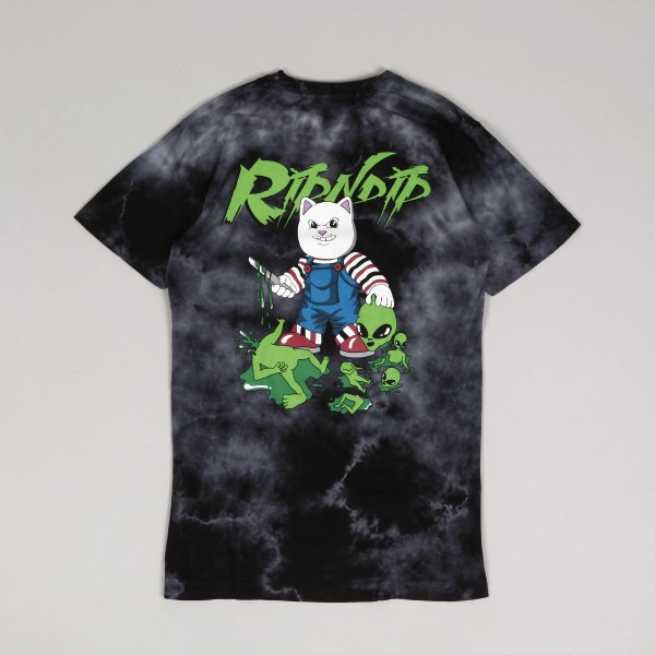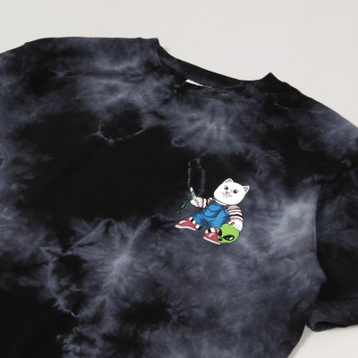 Ripndip t-shirt with the name Childs Play Tee in black batik design, 100% cotton, small print on the chest and large print on the back of the cat Lord Nermal modified to look like the Chucky doll from the movie Child's Play. Contrasting Ripndip inscription above the graphics. Made in Mexico.