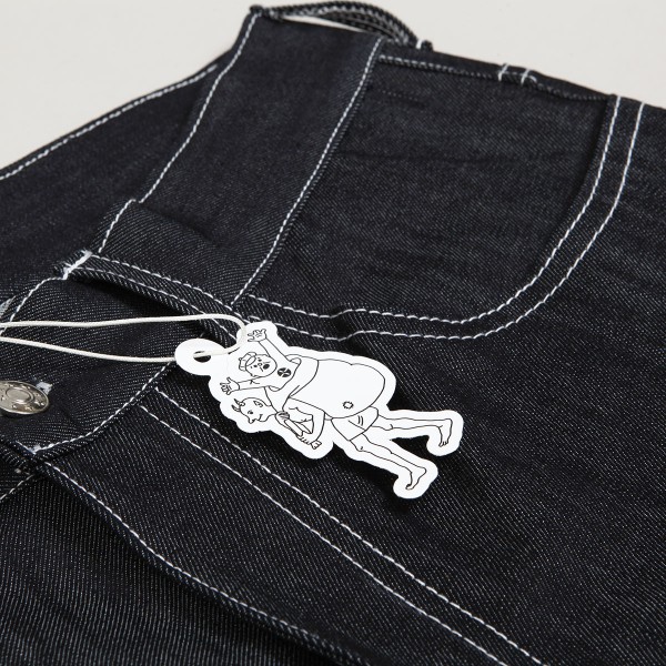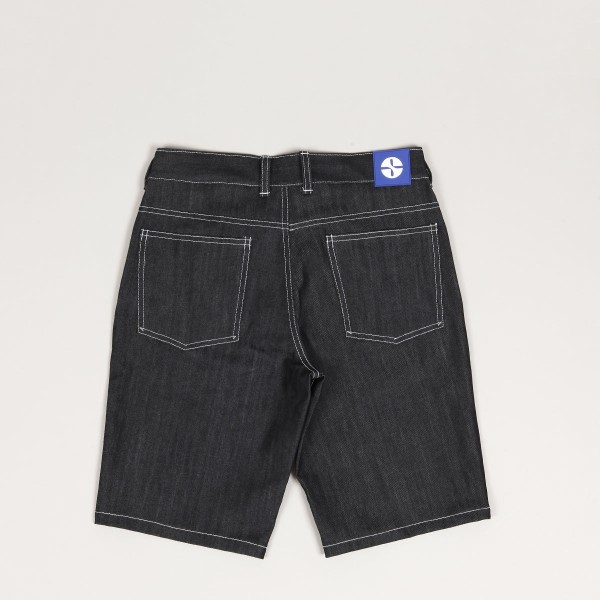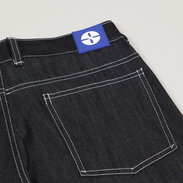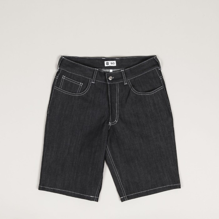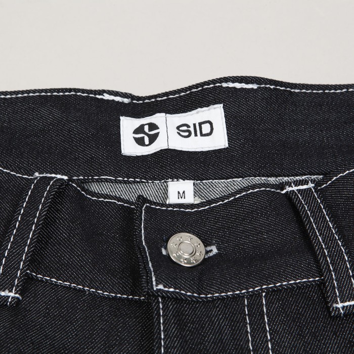 Denim shorts from the Czechoslovak skate brand SID Limited. Model called 7S1 Shorts in dark blue with contrasting white stitching. They have a wide cut - Baginess 6.9/10. Button closure and covered YKK zipper. Rubber patch with SID logo on the back. Made of 100% cotton.