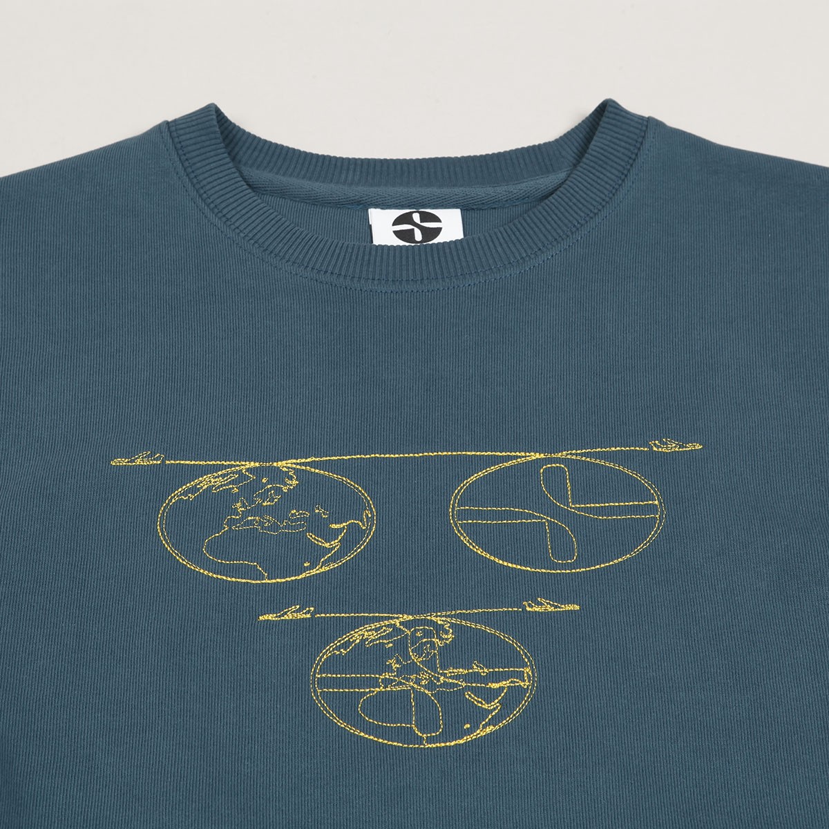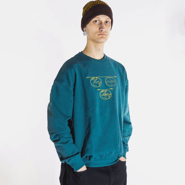 Long-sleeved sweatshirt from the Czechoslovak skate brand SID Limited. Model called Sid Air Tricircle Crewneck in Peacock color. Embroidered graphics of airplanes, globe and SID logo on the chest. Ribbed, tapered sleeves and waist. Wider, looser Boxy Fit cut. Made of 100% cotton with a higher weight, GOTS, Vegan, Fairwear.