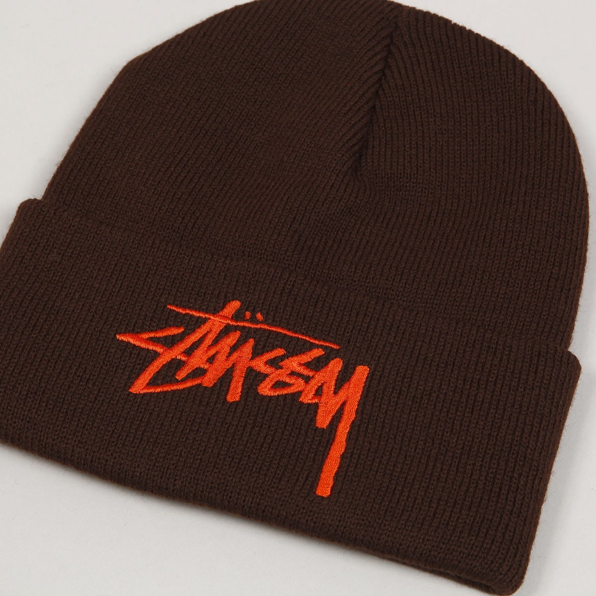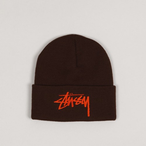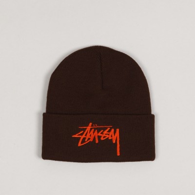 Stussy beanie called Big Stock Cuff Beanie in brown. Folded hem with large contrasting orange embroidery of the large Stock Stussy logo. Material 100% acrylic. Universal size, fits most.