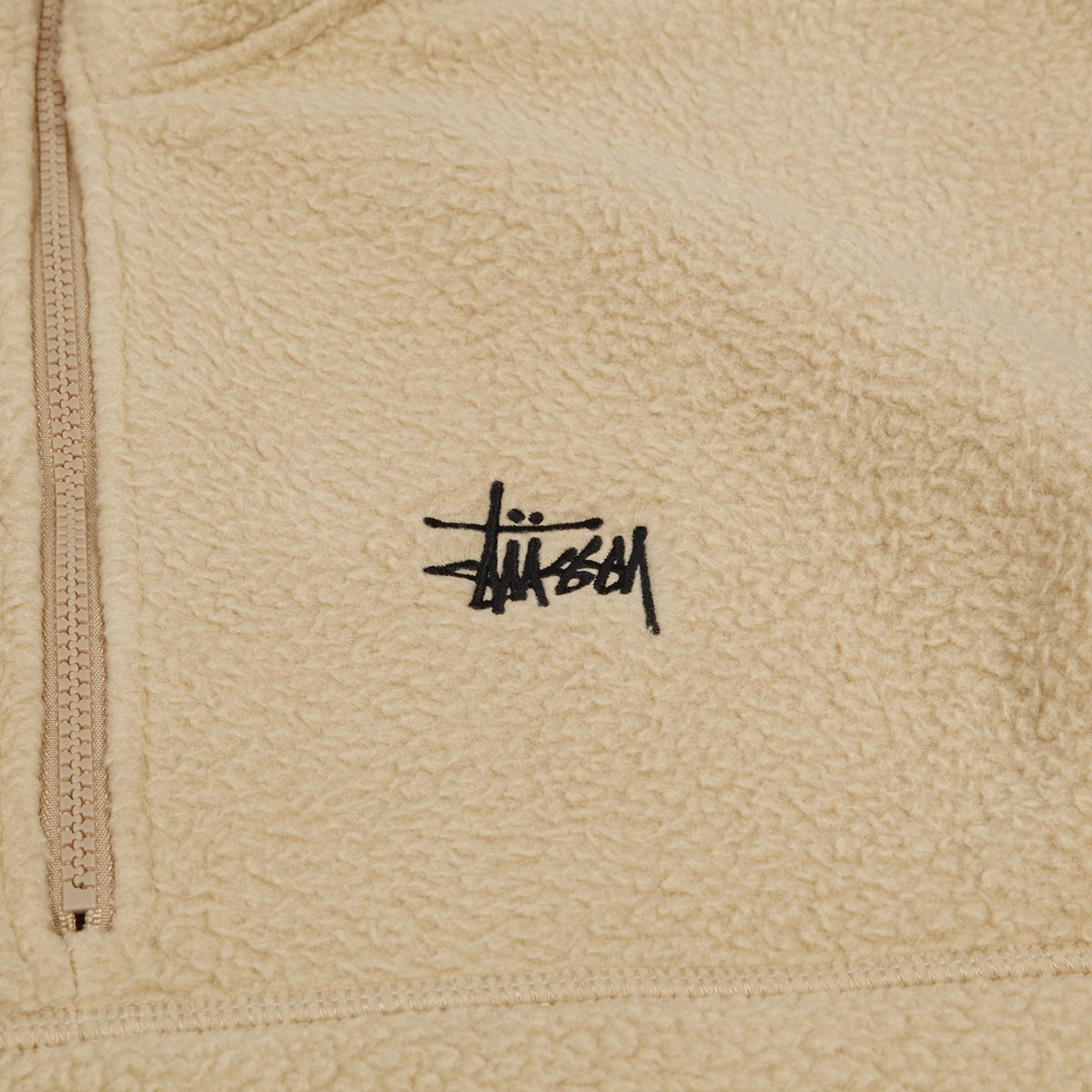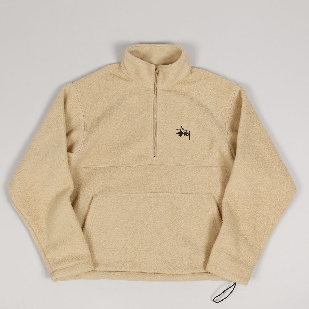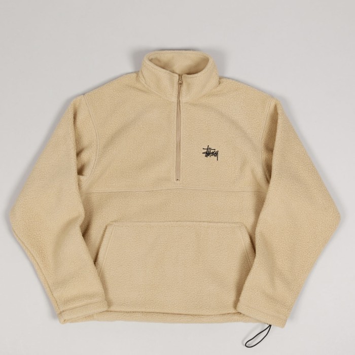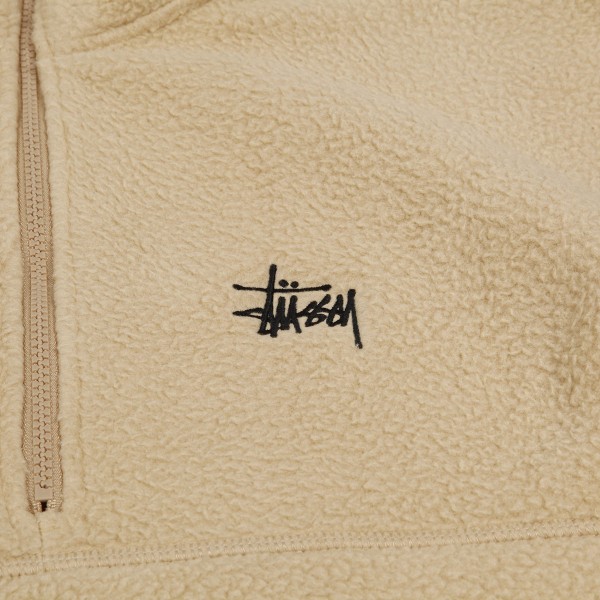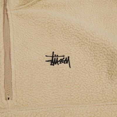 Stussy insulated sweatshirt with a high collar and half-zip fastening. Model called Half Zip Mock Neck in beige with a small embroidered Stussy logo on the left chest. Kangaroo pocket on the stomach for small items. Drawstring waist. Material is 100% polyester polar fleece.
