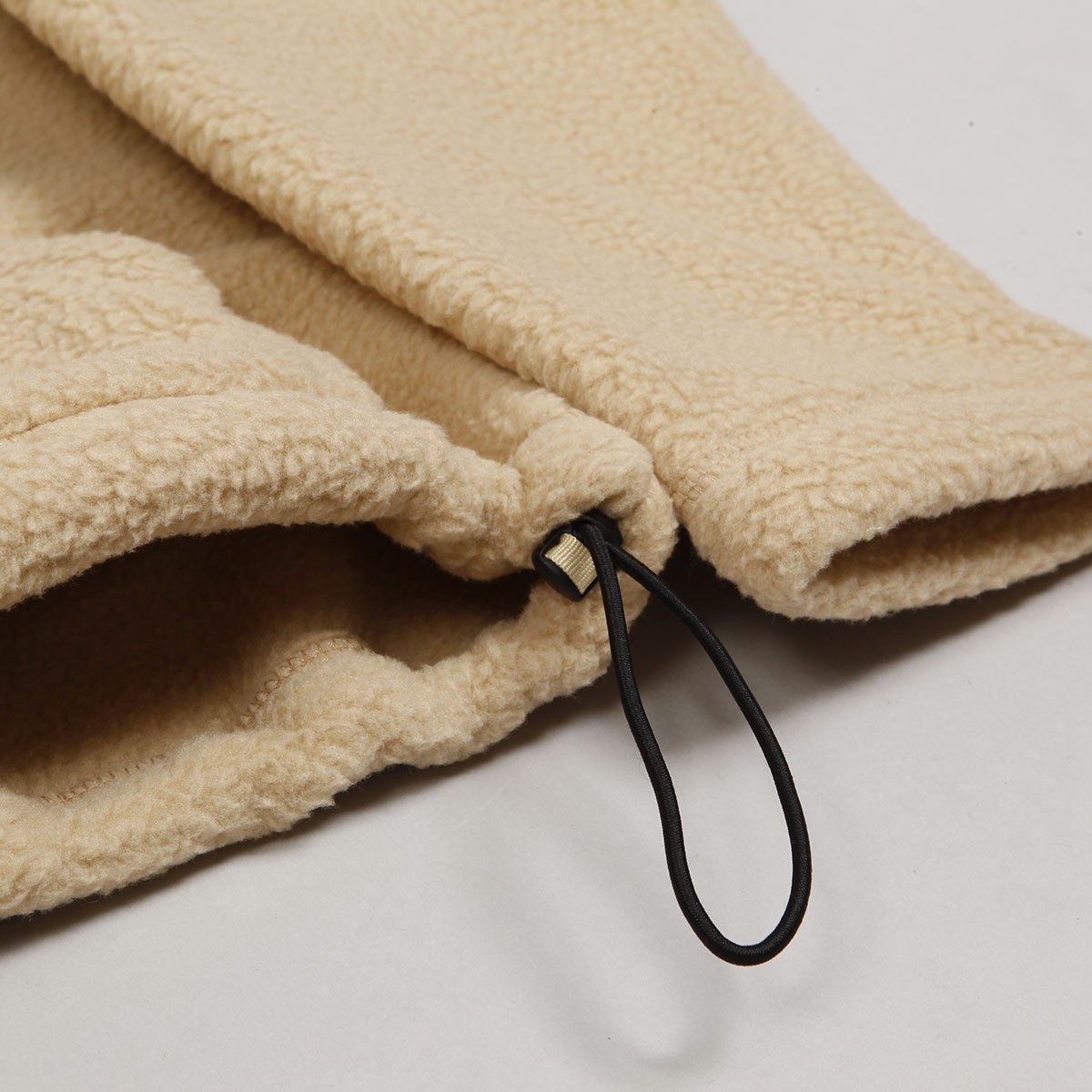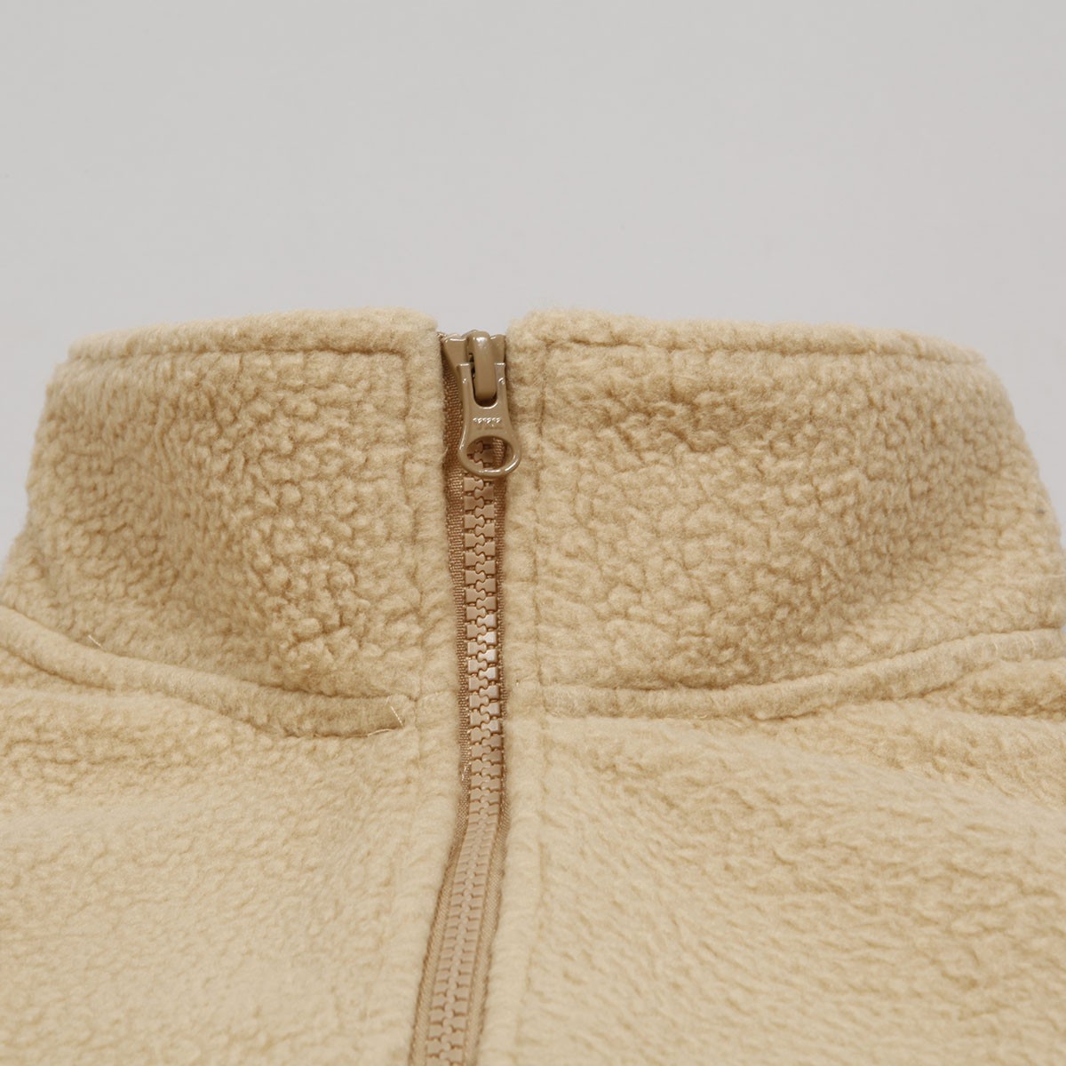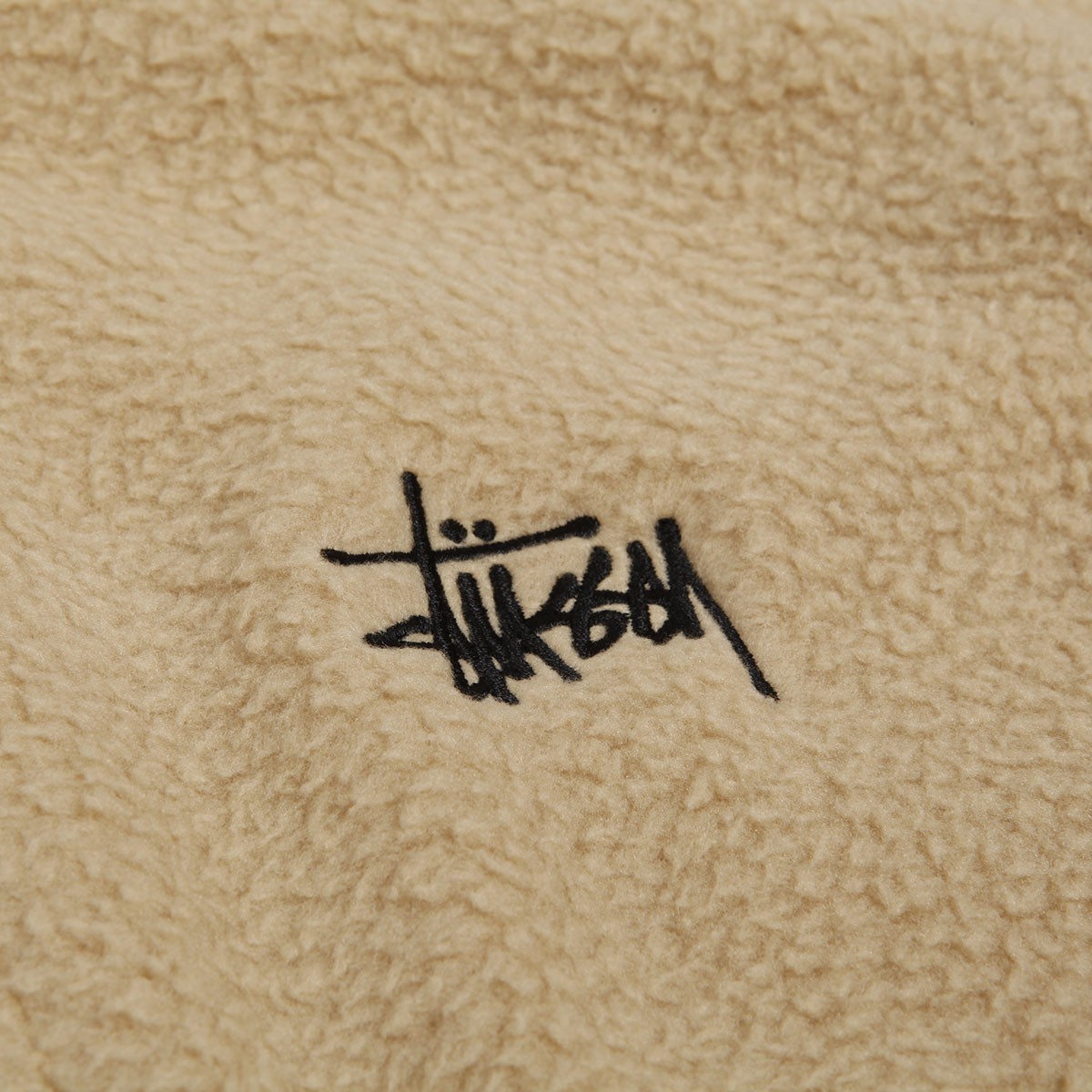 Stussy insulated sweatshirt with a high collar and half-zip fastening. Model called Half Zip Mock Neck in beige with a small embroidered Stussy logo on the left chest. Kangaroo pocket on the stomach for small items. Drawstring waist. Material is 100% polyester polar fleece.