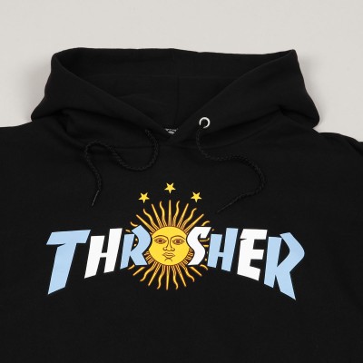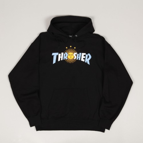 Thrasher Magazine Argentina Hoodie in black. Material 100% cotton. The cut of the sweatshirt is "regular fit" with tapered raglan sleeves. Elastic knits on the sleeves and bottom hem of the sweatshirt. Removable hood and large front pocket. Thrasher logo printed on the chest in the form of the Argentine flag. The graphic was created by Tony Vitello, who pays tribute to his father from Argentina and also to football. The three stars above the graphic symbolize the three victories in the FIFA World Cup in 1978, 1986 and 2022.