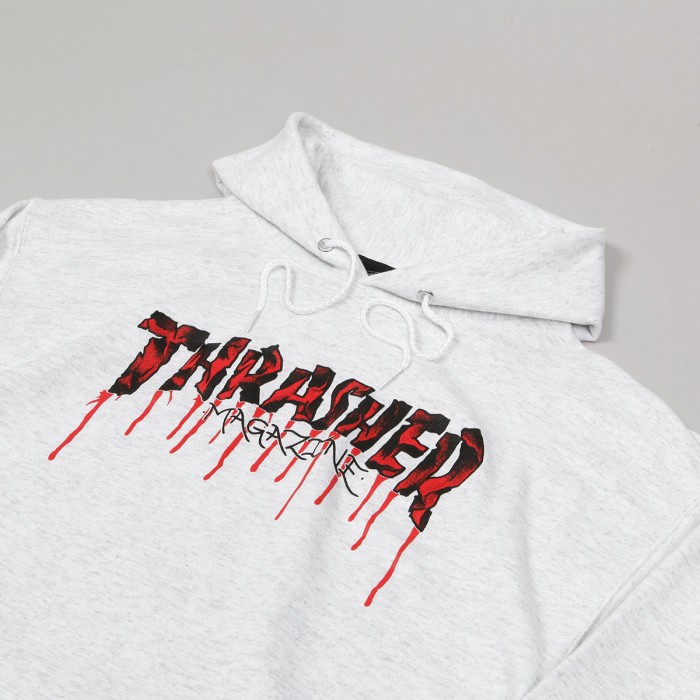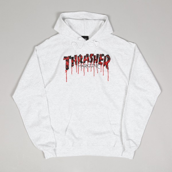 Thrasher sweatshirt in gray color called Blood Drip Hoodie. The cut of the sweatshirt is "regular fit". Removable hood, printed on the chest with a bloody Thrasher magazine logo with dripping blood. Graphics created by Devon Blood.