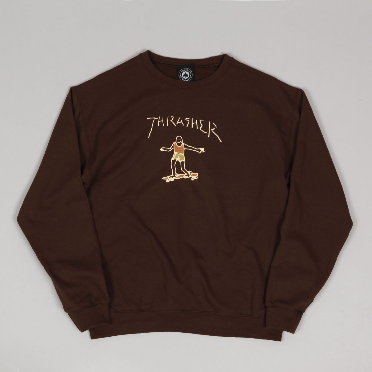 Thrasher dark chocolate brown Gonz Crewneck sweatshirt. Regular fit. Gonz graphic printed on the chest by legendary skater and artist Mark Gonzales. Elastic knits on the sleeves and bottom hem.