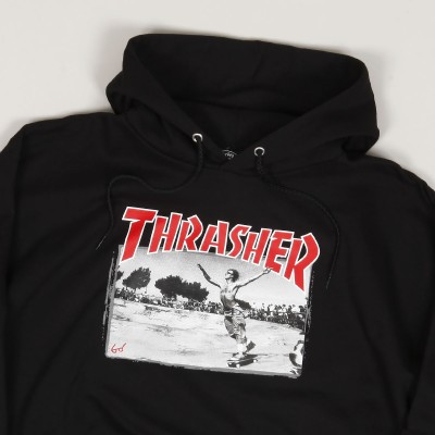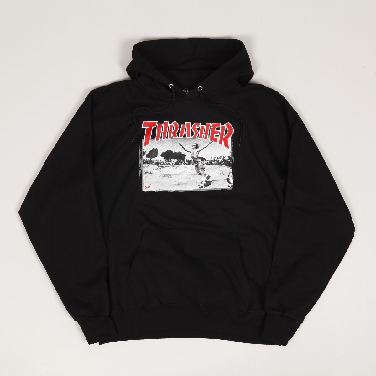 Thrasher Magazine Jake Dish Hoodie in black. 100% cotton. Regular fit with tapered raglan sleeves. Elasticated cuffs and hem. Drawstring hood and large front pocket. Contrasting Thrasher logo print with Jake Phelps photo on chest. Graphic by Tony Vitello. Captures Jake at The Dish skatepark, near Thrasher HQ, in October 1985. This is one of Tony's most popular photos of Jake.