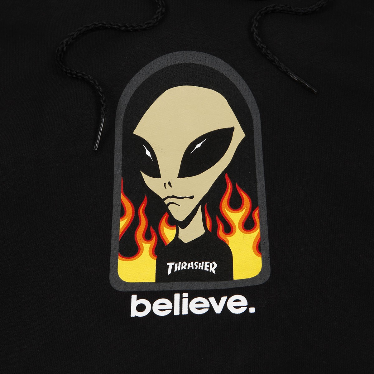Thrasher Magazine sweatshirt from a special collaboration with the Alien Workshop brand. Model called Believe Hoodie in black. The cut of the sweatshirt is "regular fit" with tapered raglan sleeves. Elastic knits on the sleeves and bottom hem of the sweatshirt. Removable hood and large front pocket. On the chest there is a print of an alien dressed in a Thrasher T-shirt and the inscription "believe.".