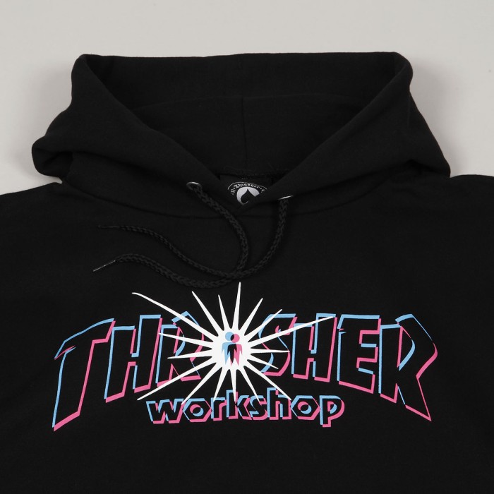 Thrasher Magazine sweatshirt from a special collaboration with the Alien Workshop brand. Model called Nova Hoodie in black. The cut of the sweatshirt is "regular fit" with tapered raglan sleeves. Elastic knits on the sleeves and bottom hem of the sweatshirt. Removable hood and large front pocket. On the chest there is a print of the Skatemag Thrasher logo and the Workshop inscription with a shining star.
