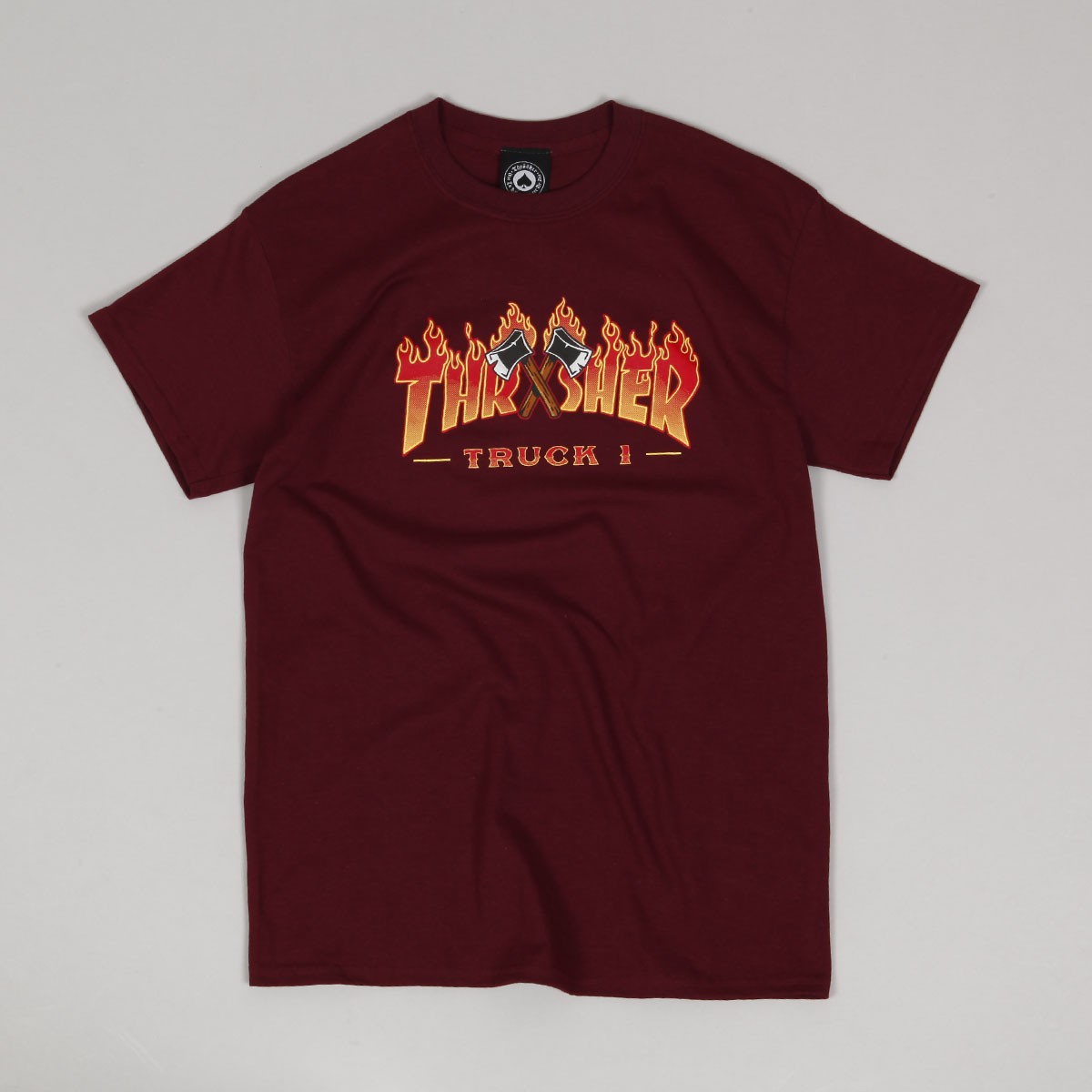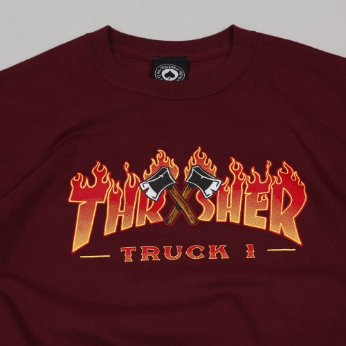 Thrasher Magazine T-shirt called Truck 1 Tee in dark red. Material 100% cotton. Classic REGULAR cut with short sleeves. Printed on the chest with a cartoon Flame Thrasher logo with axes.