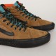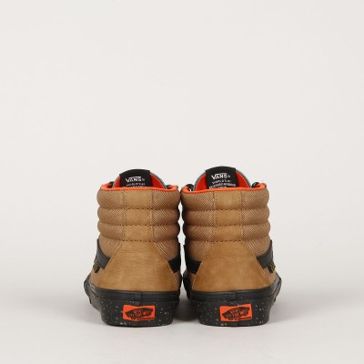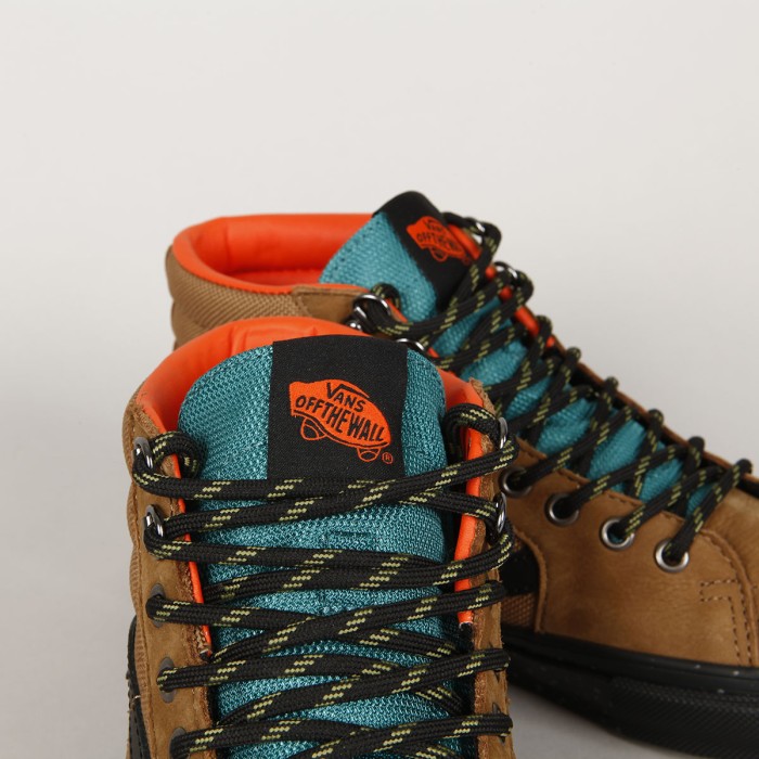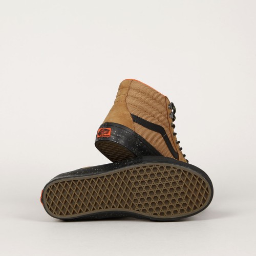 Vans shoes , model called Skate Sk8-Hi in a high ankle version inspired by outdoor footwear, from the new Skate Classic series. On the side of the shoe, a contrasting wave with a sewn-in Vans checkered flag. The upper is made of a combination of leather and reinforced canvas. Metal eyelets - D rings, round laces, padded and reinforced heel collar, elastic wedges on the tongue, very comfortable, anatomically shaped PopCush insole for shock absorption and improved rebound and a durable Duracap layer with a reinforced toe . Vulc Sickstick sole with greater stickiness and a classic waffle pattern and Vans Skateboarding logo on the heel. There are small stains on the sole imitating mud or dirt. One extra lace in the package.