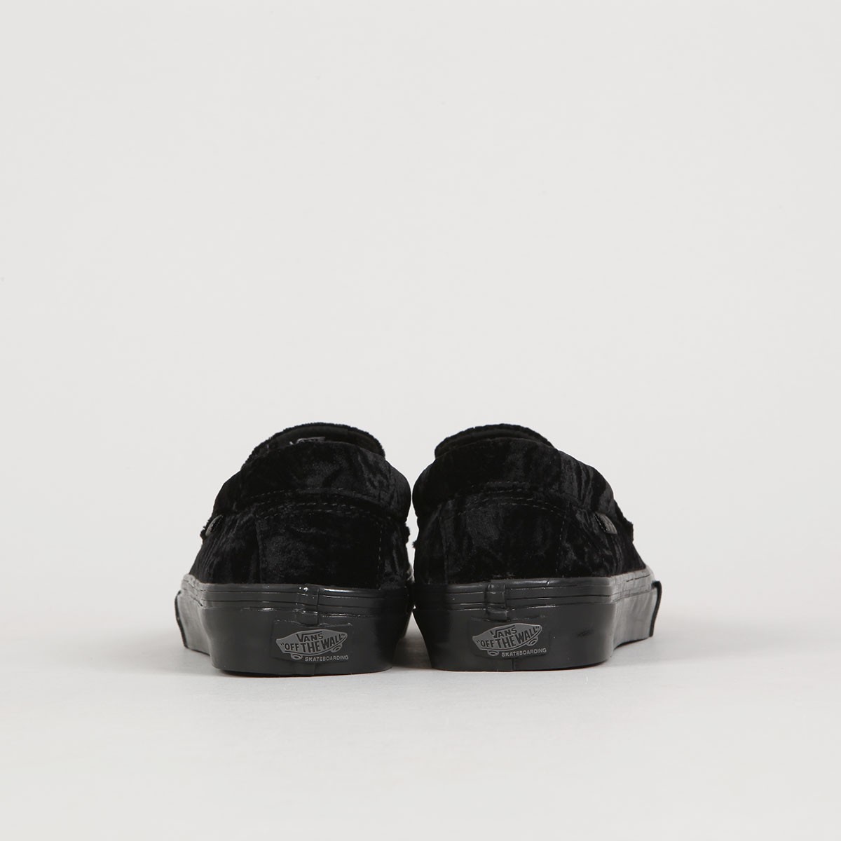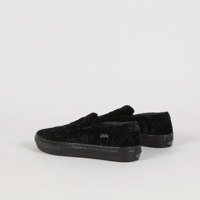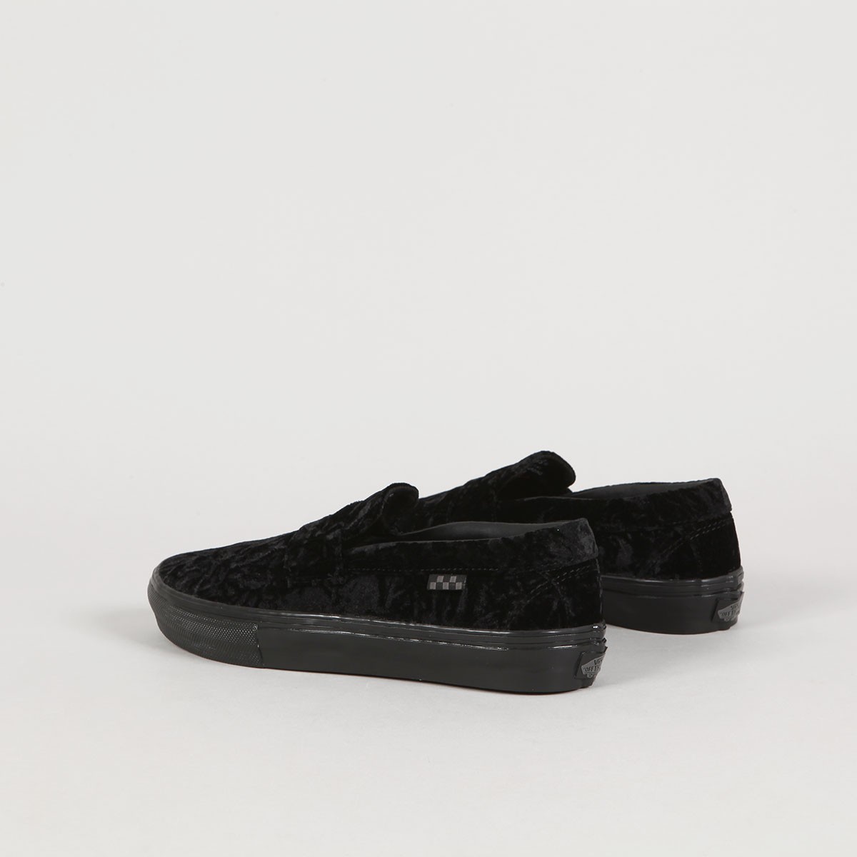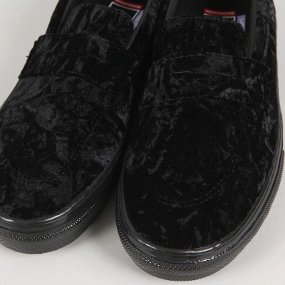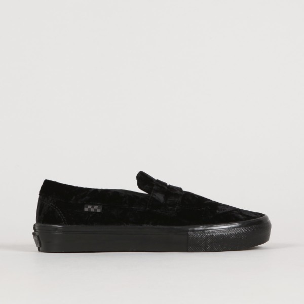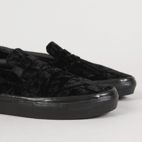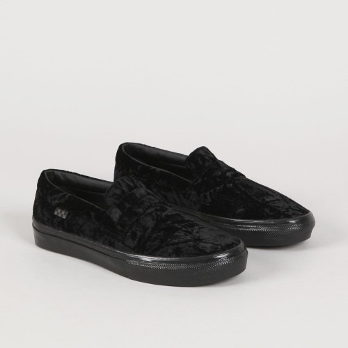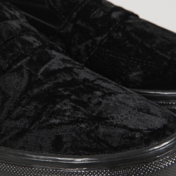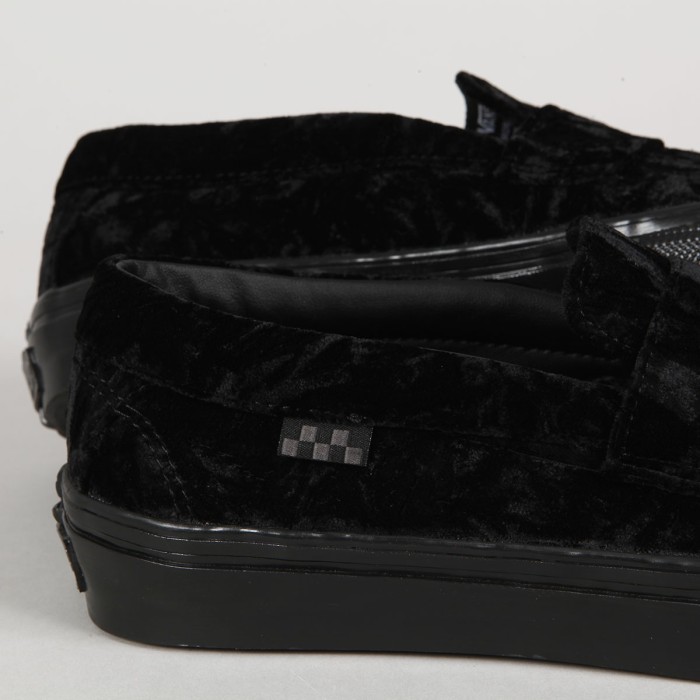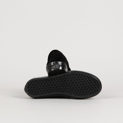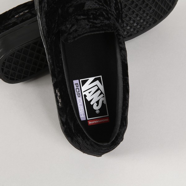 Velvet black upper with a clean design. Traditional waffle vulc sole with SickStick treatment for better stickiness to the board and Vans logo on the heel. Inside the shoe is a very comfortable, anatomically shaped PopCush insole for shock absorption and improved rebound. Duracap layer on the bottom with a reinforced toe . Leather inner trim with light padding in the ankle and heel area. On the outside of the shoes a subtle black-gray checkerboard flag.