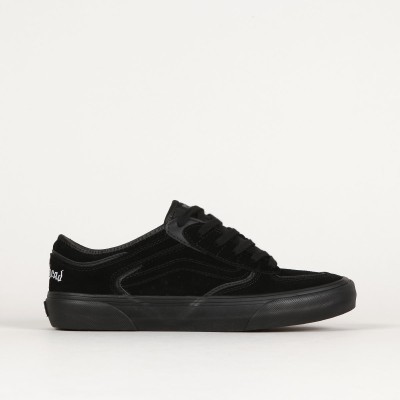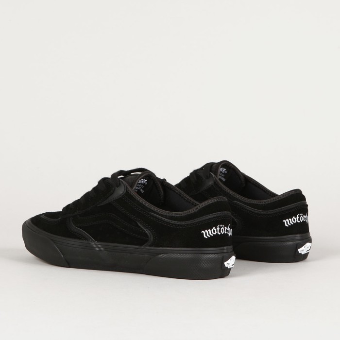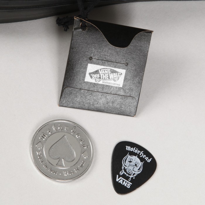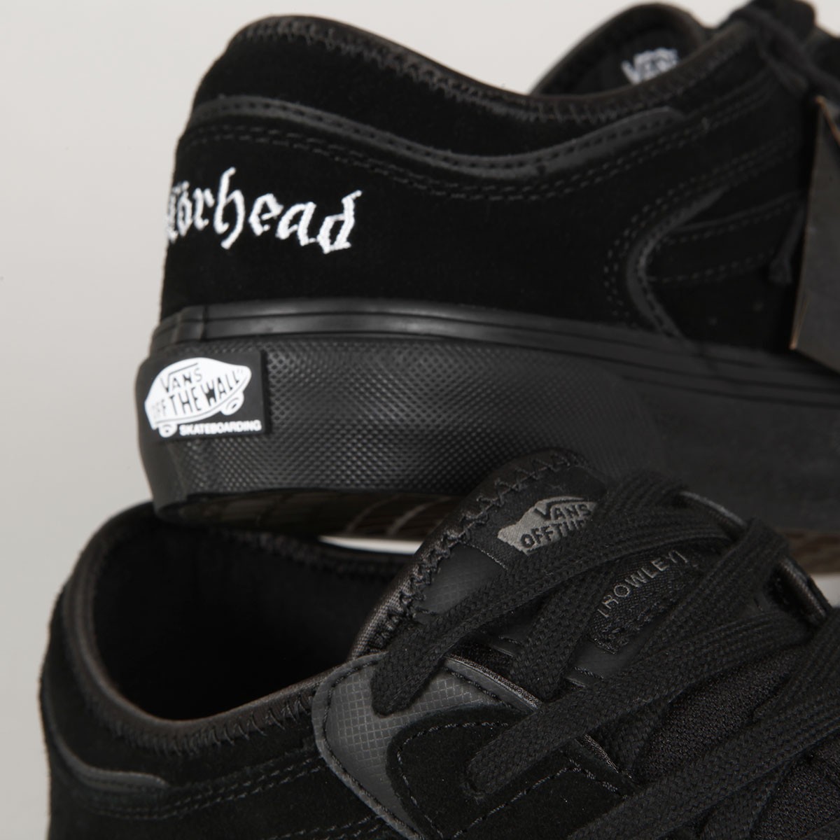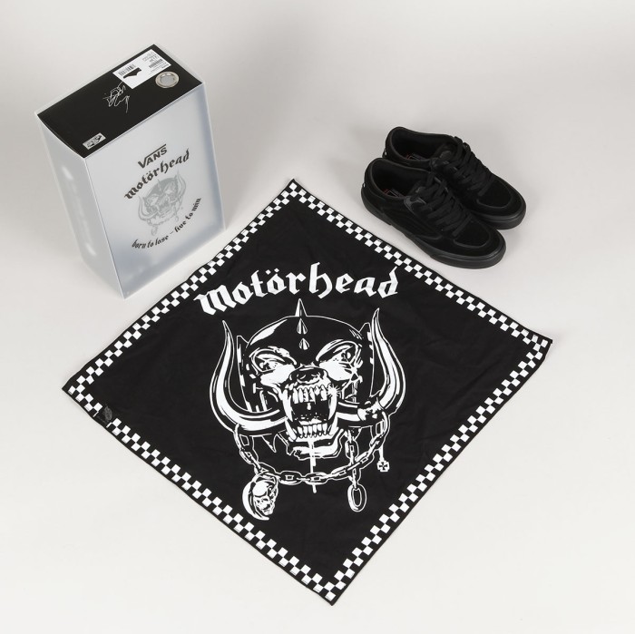 Vans shoes from a special limited collaboration with the legendary English heavy metal band Motörhead. The group is considered the forerunner of the new wave of British heavy metal, thanks to the mixing of several different genres of rock'n'roll, heavy metal and punk rock. In doing so, they set a completely new path and rose to the top, where they lasted for 40 years and thus consolidated their place in musical history. For the model of rider Geoff Rowley in an all-black design from the new Skate Classic series. They are made of brushed suede with leather details and have a contrasting Motörhead logo embroidered on the heel. The iconic wave sewn on the side, a thick padded tongue with Rowley's signature, lightly padded heel and ankle cuff, a very comfortable, anatomically shaped PopCush insole, with original graphics, for shock absorption and a durable Duracap layer with a reinforced toe . Vulc Gum sole with a waffle pattern and Vans logo on the heel . Improved heel support with Wafflecup technology. One extra lace included. Packaged in the original transparent box and scarf with the Motörhead x Vans logo. Plus a silver coin and a pick.