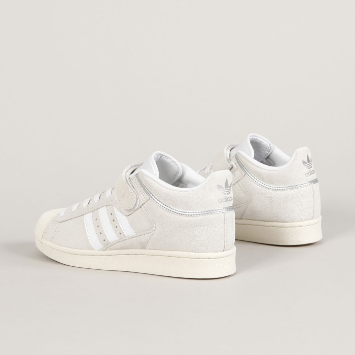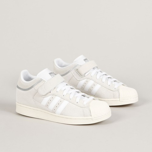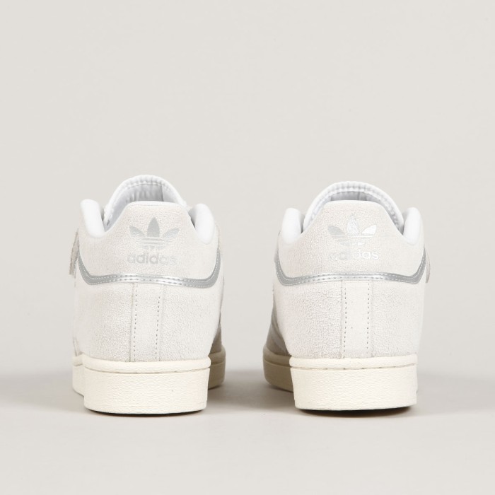 Adidas Skateboarding shoes , Pro Shell ADV model in White/Metallic Silver/Cloud White colorway. The shoe is based on the legendary Adidas Superstar basketball model and has more than 50 years of history. Suede upper with reinforced rubber "shelltoe" toe and very comfortable, specially shaped Adiprene inner sole. Quilted sole around the entire perimeter and perforations on the sides for better ventilation. Padded inner heel rim, leather Adidas logo on the heel and gold Adidas print on the tongue. Velcro strap covers the upper eyelet of the laces and serves to tie the shoe more firmly. On the sides, iconic three leather stripes with gold Pro Shell lettering.