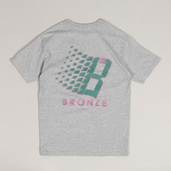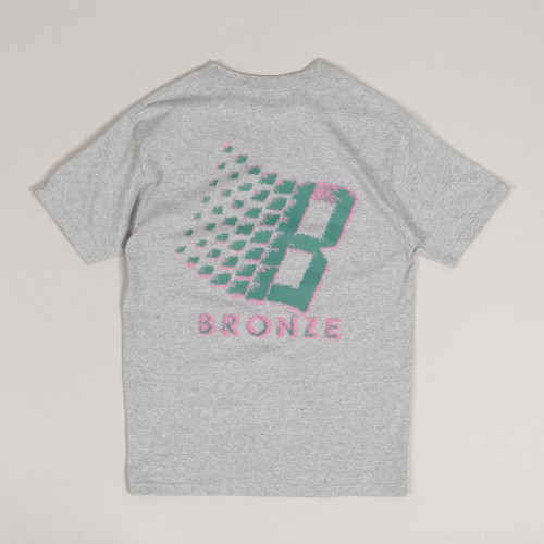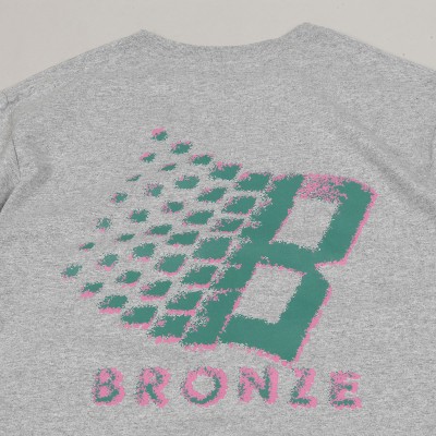 Bronze 56K B Streaker Logo Tee in brindled grey. Classic cut with short sleeves and a round collar. Small logo on the chest and large Bronze logo graphic on the back. Bronze logo is inspired by the iconic Microsoft Windows logo from the 90s. Made of 100% cotton.