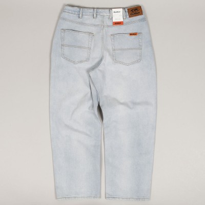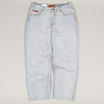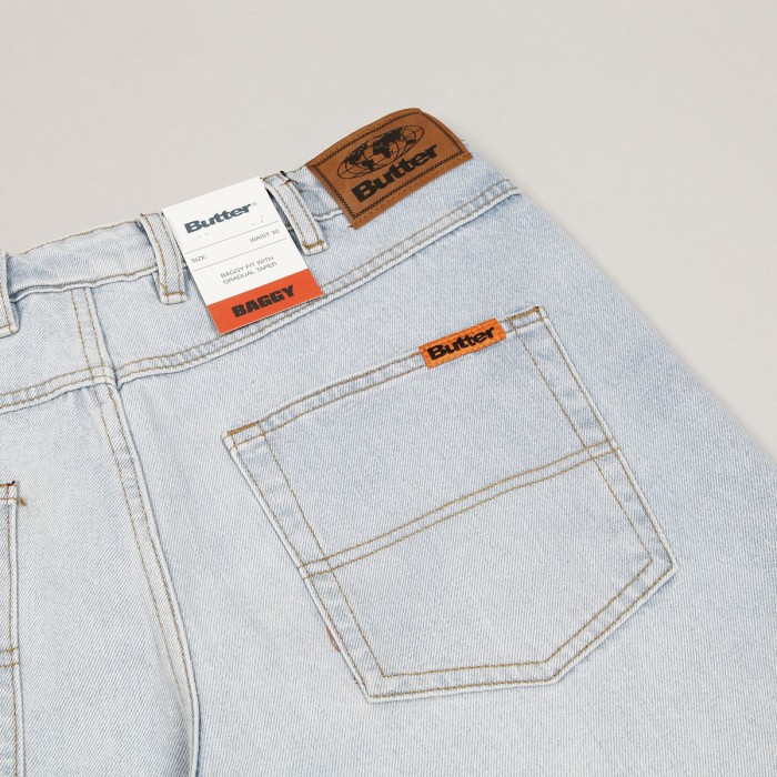 Jeans from the collection of the Australian brand Butter Goods , founded in 2008 by skaters and friends Garth Mariano and Matt Evans. The model called Baggy Denim Jeans Pants in light blue with brown stitching has a wide Baggy Fit cut. Contrasting orange patch with the Butter logo on the front and back pockets. Hidden drawstring at the waist. Rectangular leather patch with the embossed Butter label on the upper hem on the right side.