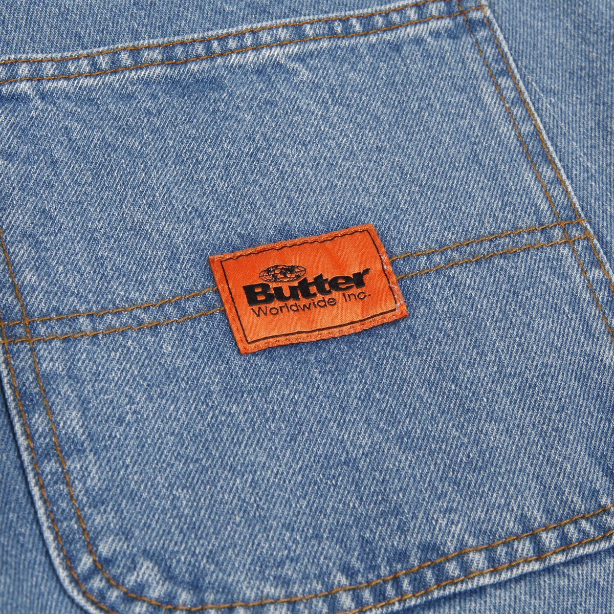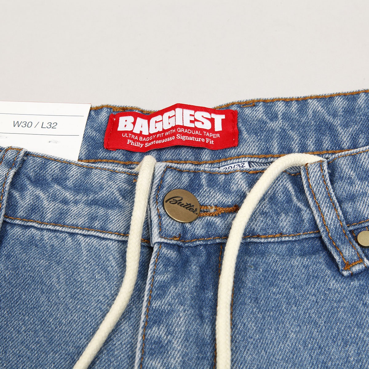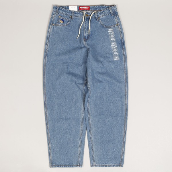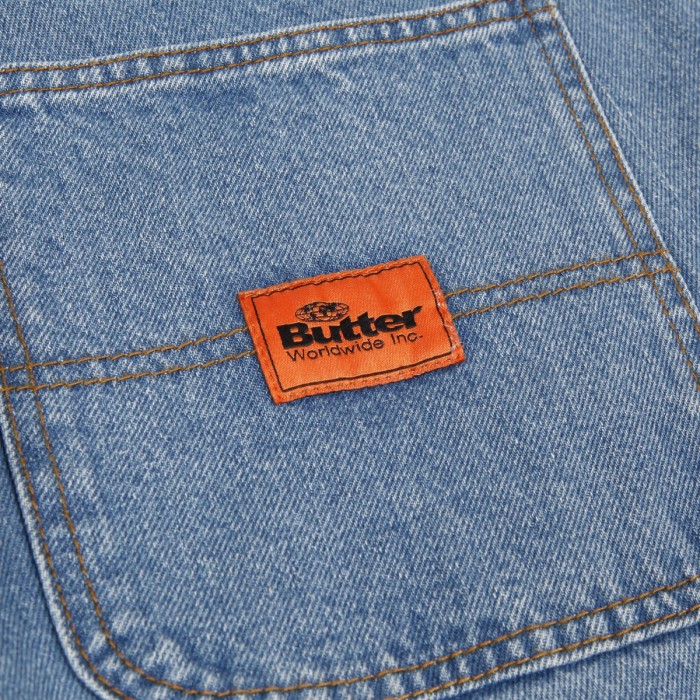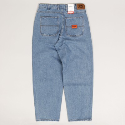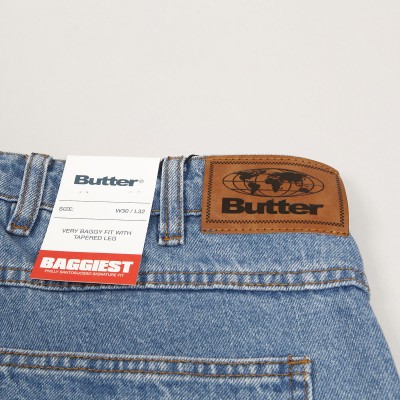Jeans from the collection of the Australian brand Butter Goods , founded in 2008 by skaters and friends Garth Mariano and Matt Evans. The model called Santosuosso Denim Pants in washed blue with brown stitching has the widest Baggiest cut. On the right front pocket there is an embroidered boy's face and on the back pocket there is a patch with the brand's logo. Hidden drawstring at the waist. On the upper hem on the right side there is a rectangular leather patch with the embossed Butter label.