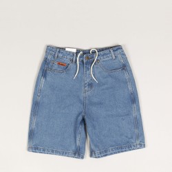 Jean shorts from the collection of the Australian brand Butter Goods , which was founded in 2008 by skaters and friends Garth Mariano and Matt Evans. The model called Baggy Denim Shorts in dark blue has a wide Baggy cut. Hidden drawstring inside the waist. Subtle Butter flag on the right front and right back pocket. Rectangular leather patch with embossed Butter label on the upper hem on the right side.