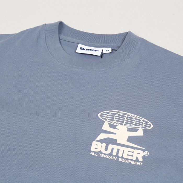 The All Terrain Tee in Slate blue has a small print on the chest and a large print on the back with the Butter Goods logo and the All Terrain Equipment inscription. Made of 100% cotton, 220g.
