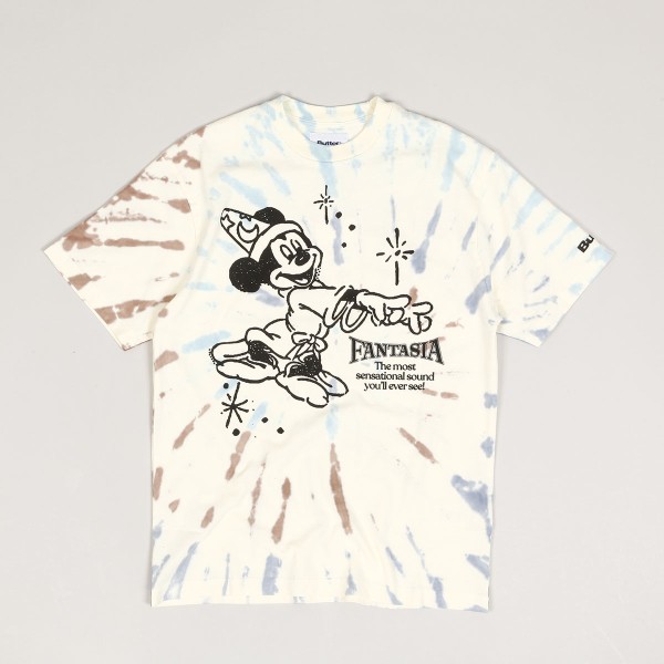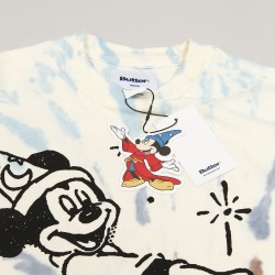 The Cinema Tee T-shirt model in a tie dye design has a Mickey Mouse print on the chest and a picture of a magic broom with a large Fantasia inscription on the back. Made of 100% cotton, 220g.