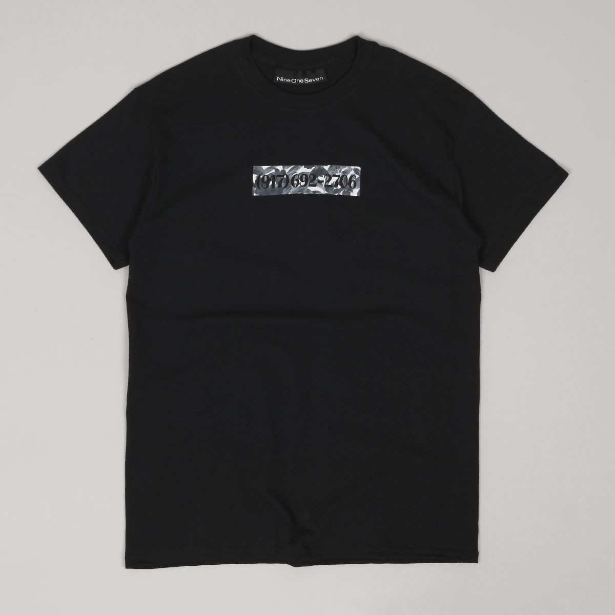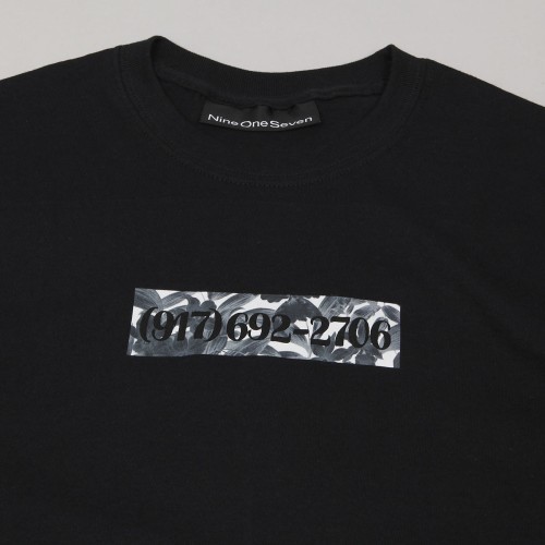 Call Me 917 Dialtone Box Tee in black with a camouflage box logo graphic and a 917 phone number. Made of 100% cotton. Call Me 917 was founded by designer and skater Alex Olson. He draws inspiration for his collections from music, fashion and photography. Their products are mostly available only in selected skate shops.