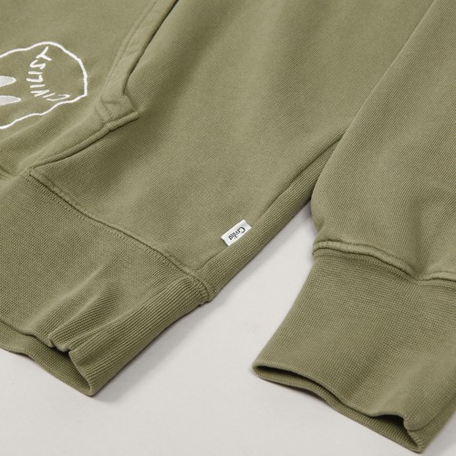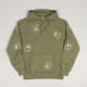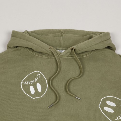Sweatshirt from the Civilist brand, model called Allover Smiler Hoodie in olive color. All-over motif of embroidered smileys with the Civilist logo. The sweatshirt has a hood with drawstrings, a large kangaroo pocket on the stomach for small items. Ribbed elastic sleeves and waist. On the left side there is a subtle flag with the Civilist inscription. Made of 100% cotton.