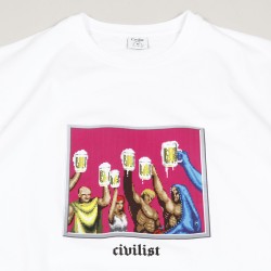 T-shirt from the Civilist brand, model called The End in white. On the chest there is a painted image of characters holding beer, under the graphic the Civilist logo. The motif was created by Jan Stolze. On the left side there is a subtle flag with the inscription Civilist. Made of 100% cotton.