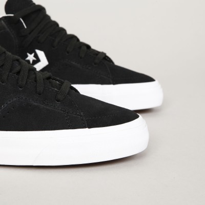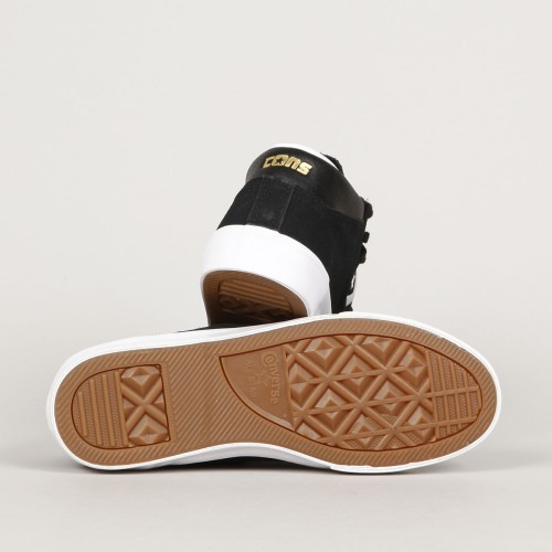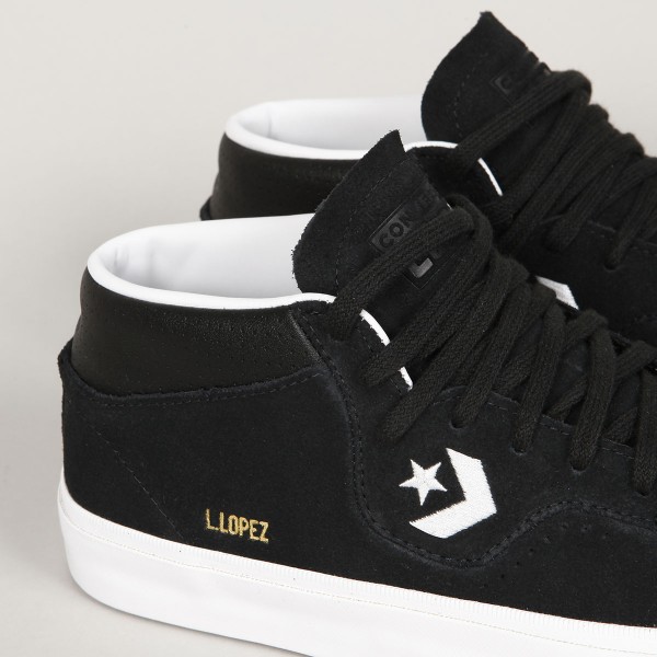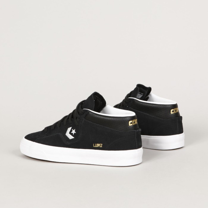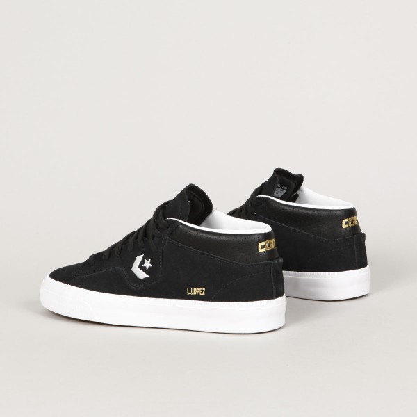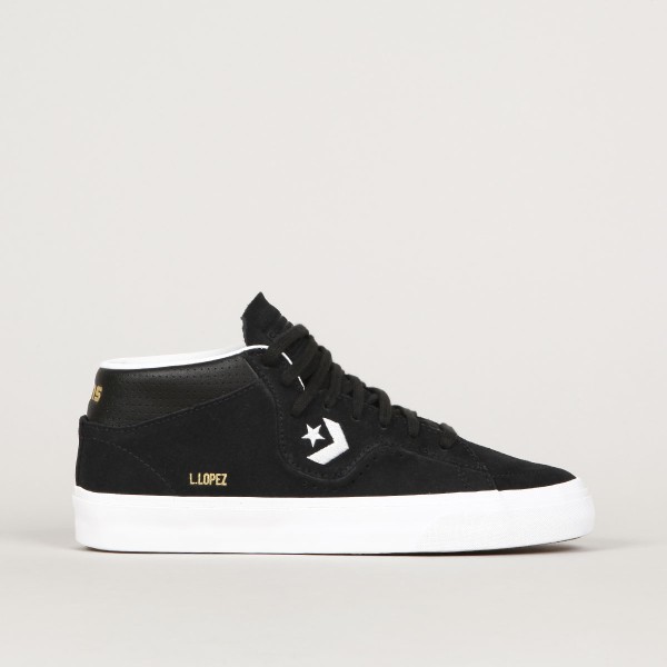 Converse CONS shoes . Pro-model Louie Lopez Pro Mid in black with a vulcanized white sole. Clean, long toe with subtle stitching and leather inner heel. Contrasting Star Chevron logo embroidered on the side of the shoe. High padded ankle collar, durable toe cap and inner foam insert for softer impacts and greater comfort. Gold L. Lopez lettering on the outside of the shoes. Gold Cons lettering embossed on the heel and the Converse CONS logo on the tongue.