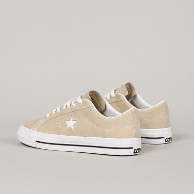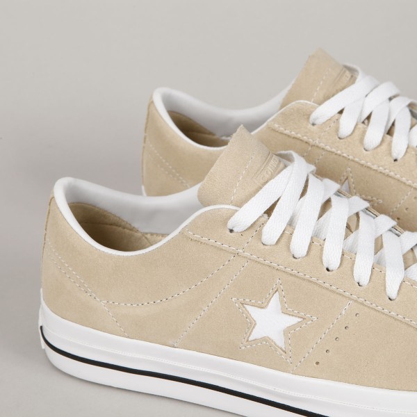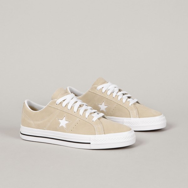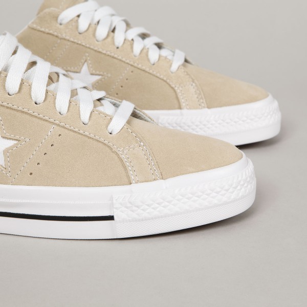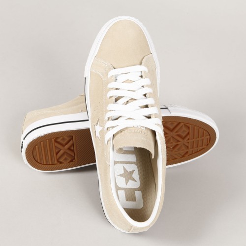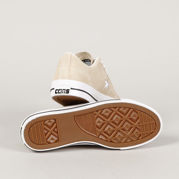 Converse shoes from the CONS skate line. Model One Star Pro OX Oat Milk White in suede with white stitching, vulc sole with CONS logo on the heel and an embroidered star on the side of the shoe. Padded ankle collar, durable toe cap and inner foam insert for softer impacts and greater comfort. Elastic gusset inside to center the tongue. Converse CONS embroidery on the outside of the tongue.