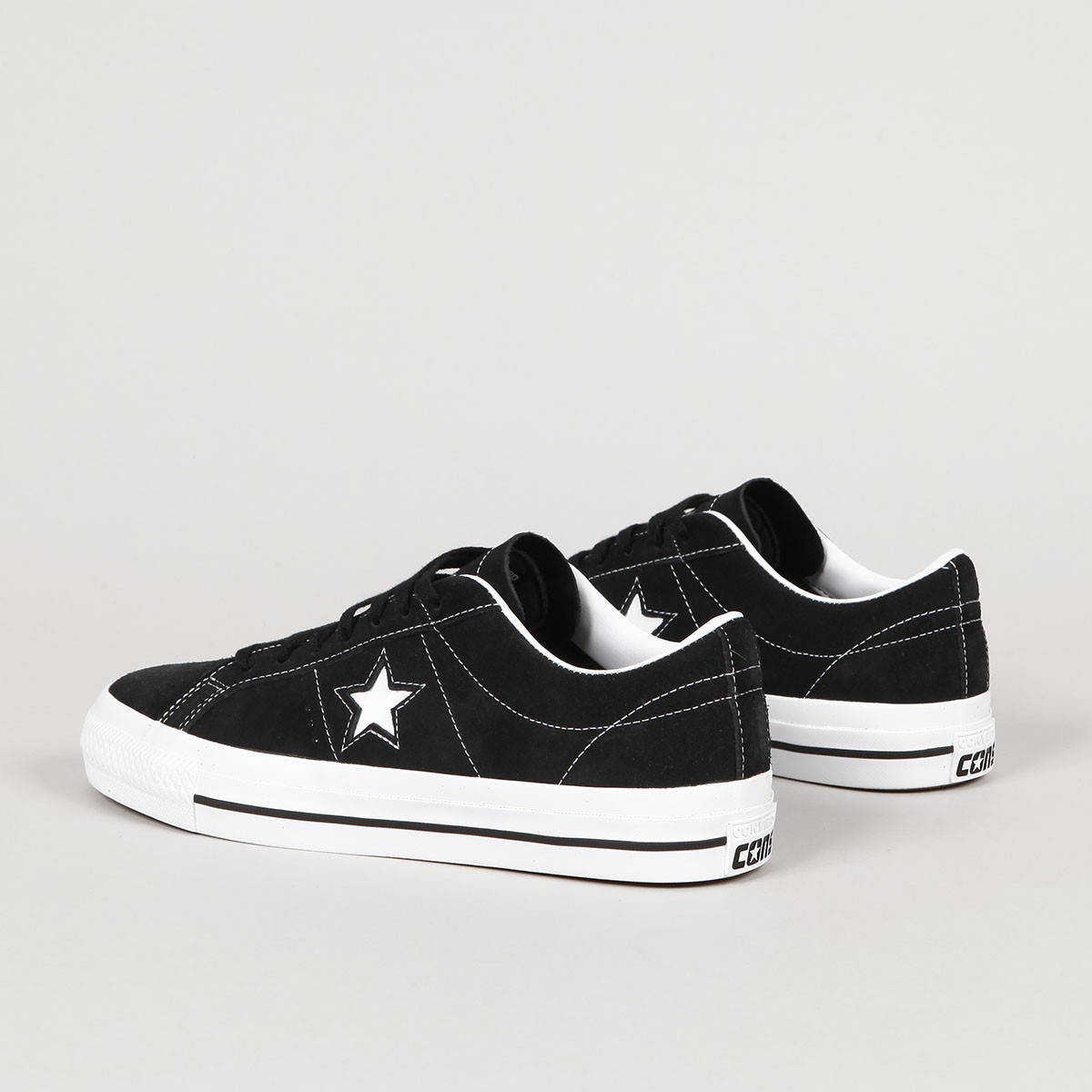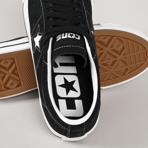 Converse shoes from the CONS skate series. One Star Pro TN+ Black White model in suede with contrasting white stitching, vulc sole with CONS logo on the heel and an embroidered star on the side of the shoe. Padded ankle collar, durable toe cap and inner foam insert for softer impacts and greater comfort. Elastic gusset inside to center the tongue. Converse CONS embroidery on the outside of the tongue.