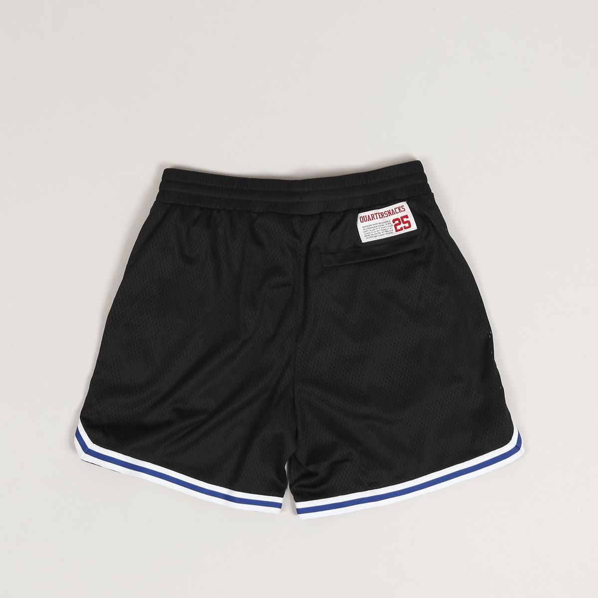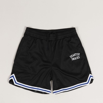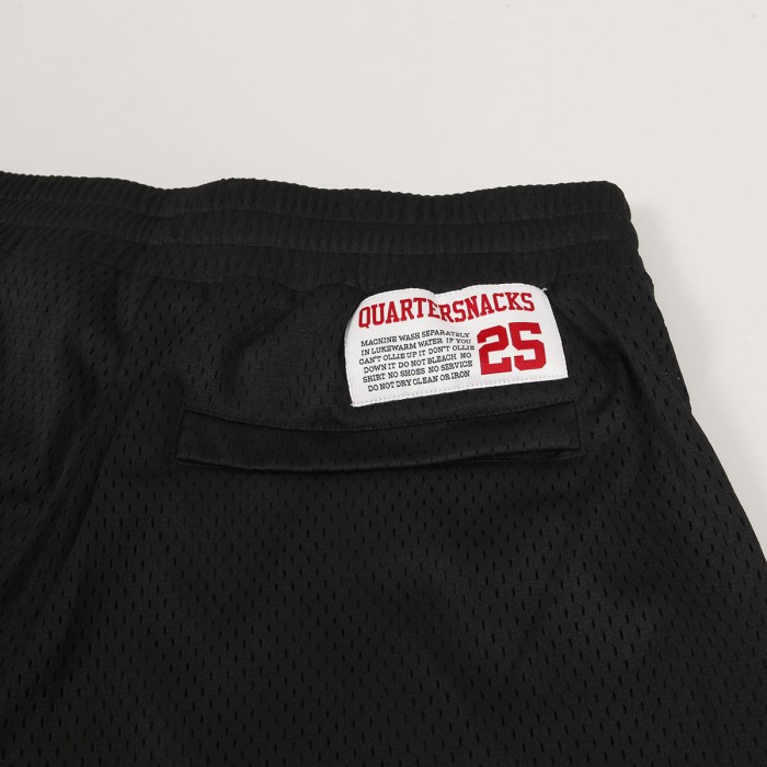 Converse shorts from the limited collection with the Quartersnacks brand, the Logo Shorts model is made of mesh with a satin lining and a loose Relaxed cut. They have a drawstring at the waist for size adjustment, two side and one back pocket with a zipper. The Quartersnacks inscription is embroidered on the left front leg, the Converse mini logo is on the right, and there is a label patch with the Converse x Quartersnacks logo above the back pocket.