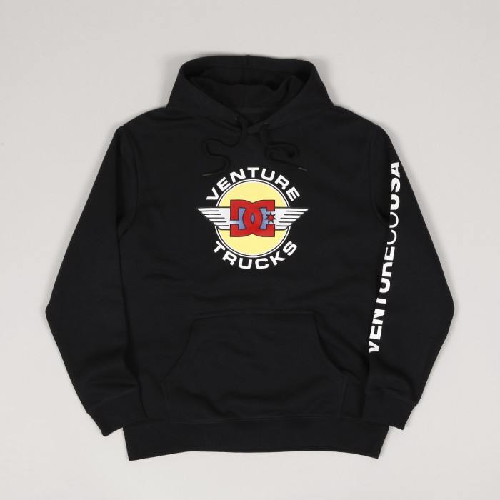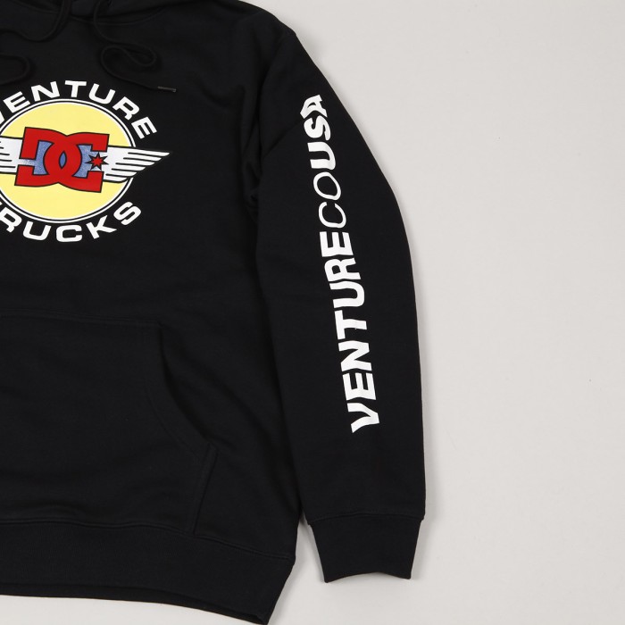 Sweatshirt from a special limited collection of DC Shoes x Venture brands. Venture company produces skate trucks and supports skaters on the streets since the 80s. Small DC x Venture logo with wings on the chest and large DC x Venture logo with wings on the back and large Venture Co USA inscription printed on the left sleeve. Small DC flag on the bottom hem. Hood with drawstring and a large kangaroo pocket on the stomach for small items. The upper material is 100% cotton with a heavy weight of 450g.