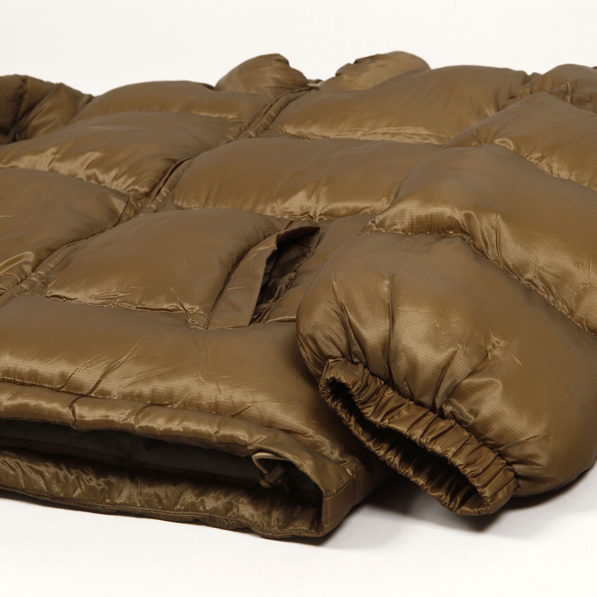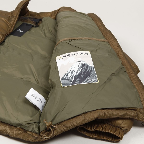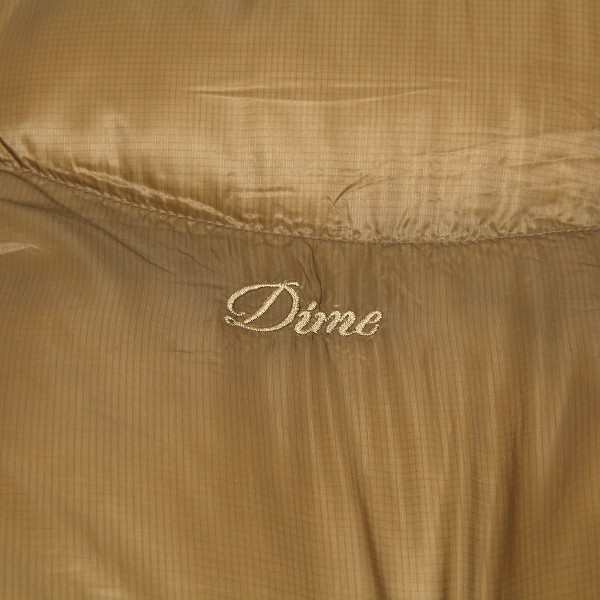 Dime jacket called Classic Ripstop Puffer Jacket in gold color. Subtle Dime logo embroidered on the left chest. Full-surface wavy stitching. Soft velvet upper, LoftTek insulation inside. Water resistant, thanks to DWR (Durable Water Repellent) surface treatment. YKK zipper closure, two pockets in the front. Elastic cuffs and waist, plus elastic waistband with slider. Material 100% nylon.
