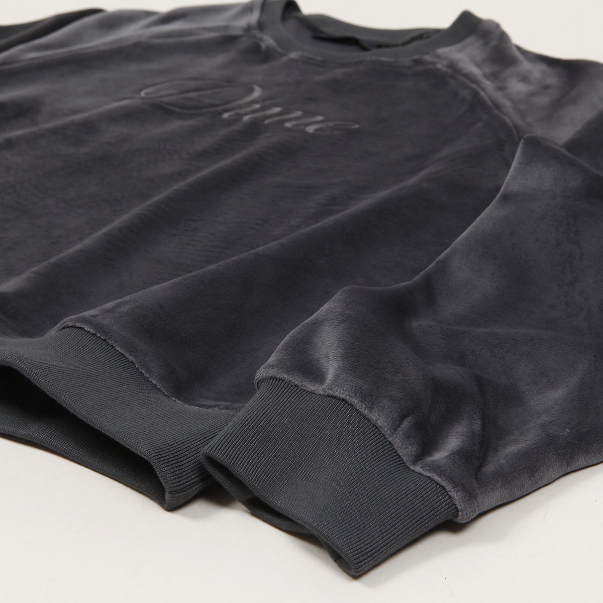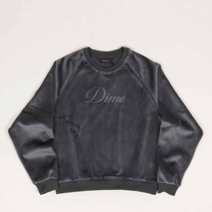 Dime sweatshirt called Cursive Velvet Crewneck in dark smoke gray. Large Dime logo embroidered on the chest . Ribbed collar, tapered, elastic sleeves and waist. All-over velvet design, pleasant to the touch. Material 100% polyester.