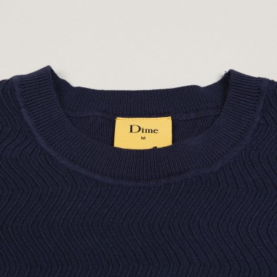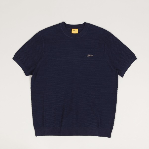 Dime T-shirt called Wave Knit Tee in dark blue. Small contrasting Dime logo on the left chest. All-over knitted wave motif. Material 50% cotton and 50% lyocell.