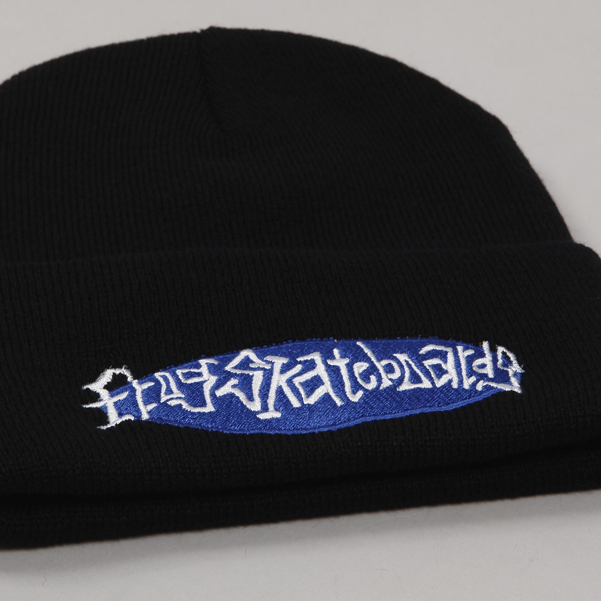 Black Frog Skateboards beanie with embroidered Frog Skateboards logo on the front. Model called Oval Logo Beanie Black has a folded hem. Universal size, fits most.