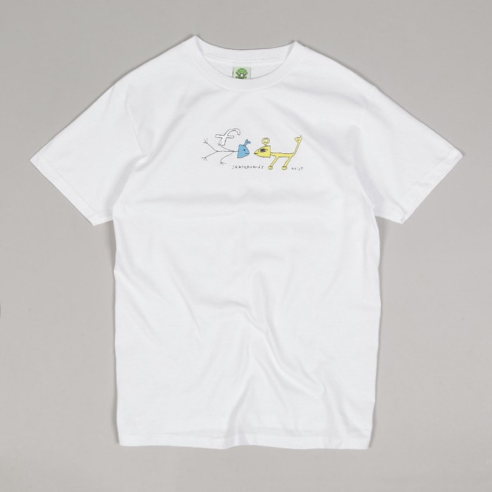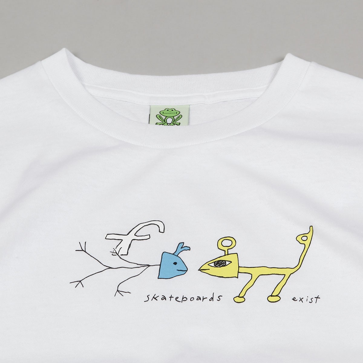 Frog Skateboards T-shirt called Frog Exists! Tee White. Contrasting graphic of cartoon frogs with the inscription Frog Skateboard printed on the chest. Round neckline with ribbing.