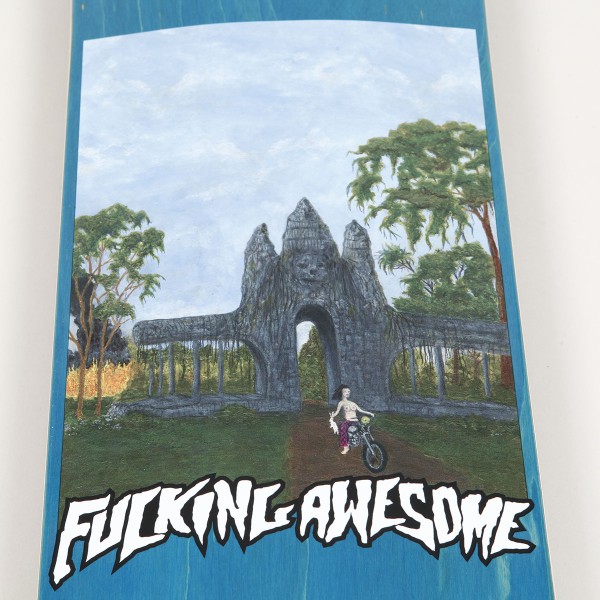 Fucking Awesome skateboard deck by Jason Dill and Anthony Van Engelen. Pro model by FA team rider Gino Iannucci called Daybreak In Phuket with graphics of a temple on the Thai island of Phuket and the Fucking Awesome logo. The deck is covered with rainbow foil. The size of the deck is 8.0 inches wide, 31.66 inches long and 14.0 inches has a wheel base. Free grip with each deck. The colored side of the wooden deck may differ from the photo shown .