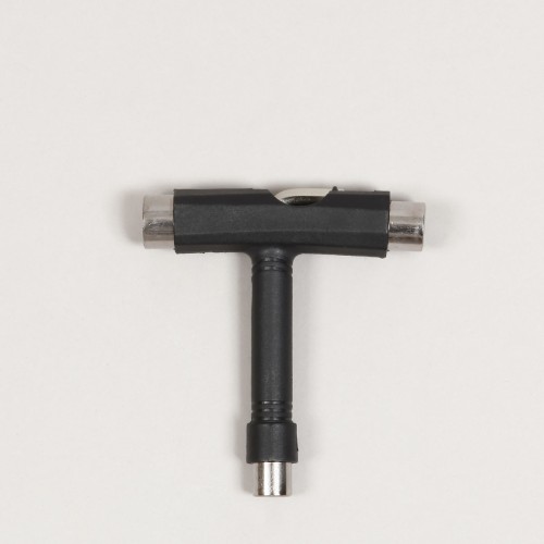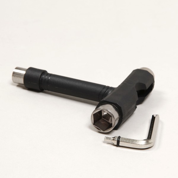 G-Tool skate tool called Skate T-Tool in black color. Plastic design, includes Allen and Phillips screwdriver, 10, 13, and 14 millimeter wrenches for tightening nuts.