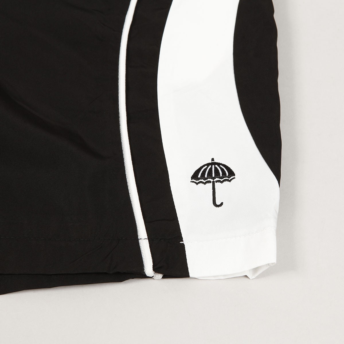 Hélas shorts from the French brand founded by skater Lucas Puig and also run by Roman Lišivka and Marek Zápražný. The model called Match Point Sport Shorts has a small umbrella embroidery on the left leg. Contrasting white waves and stripes on both sides. Two side pockets and one back pocket with a zipper and a small Hélas flag. Elastic waist with drawstring. They have an inner mesh layer. Material 100% polyester. Inspired by tennis fashion.