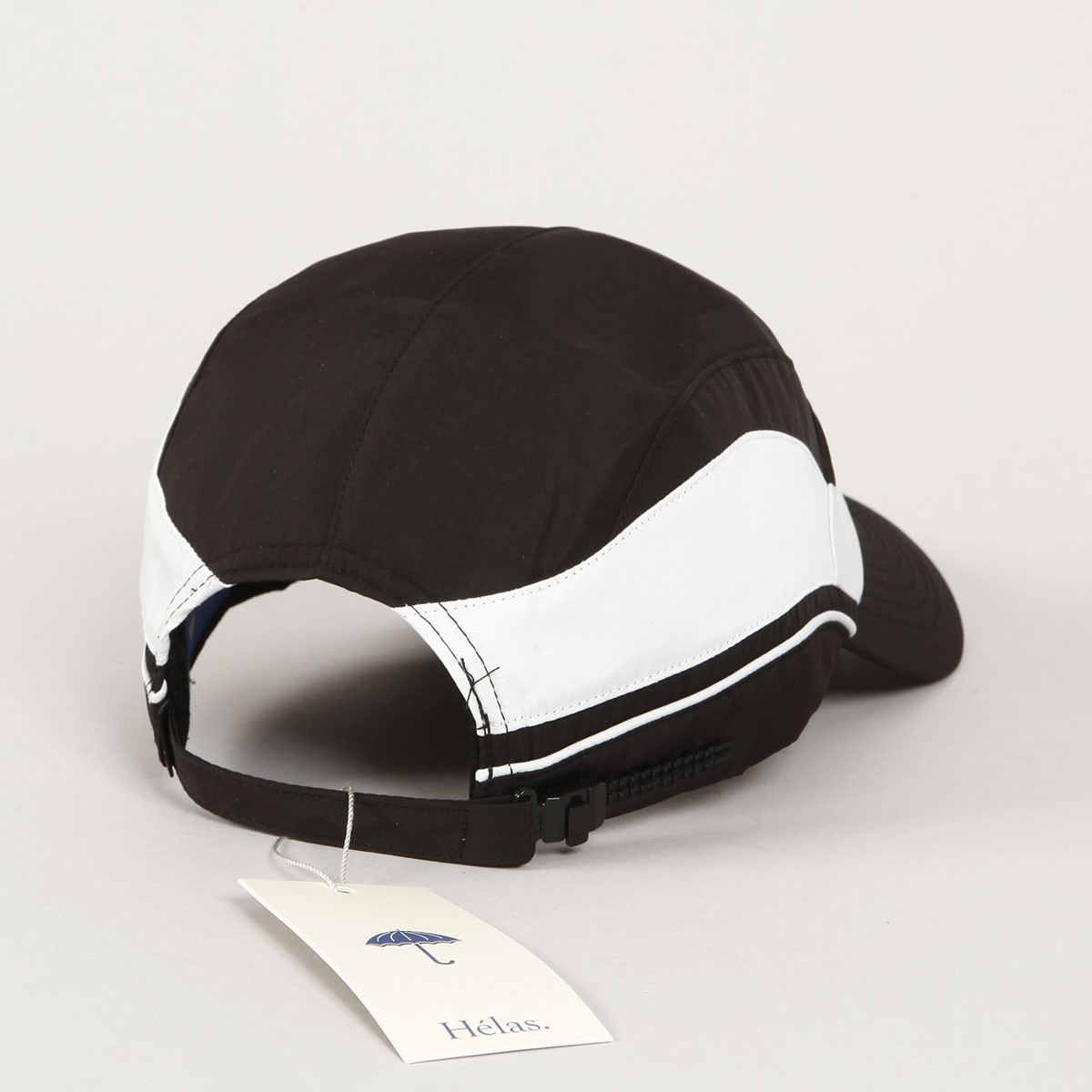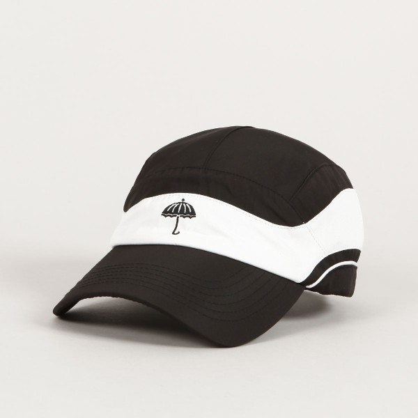 Black and white Hélas cap with a slightly curved peak and an embroidered black umbrella on the forehead. Classic five-panel construction. Fabric strap at the back with a plastic slider for size adjustment with a discreet flag. Made of 100% terylene. Inspired by vintage tennis fashion.