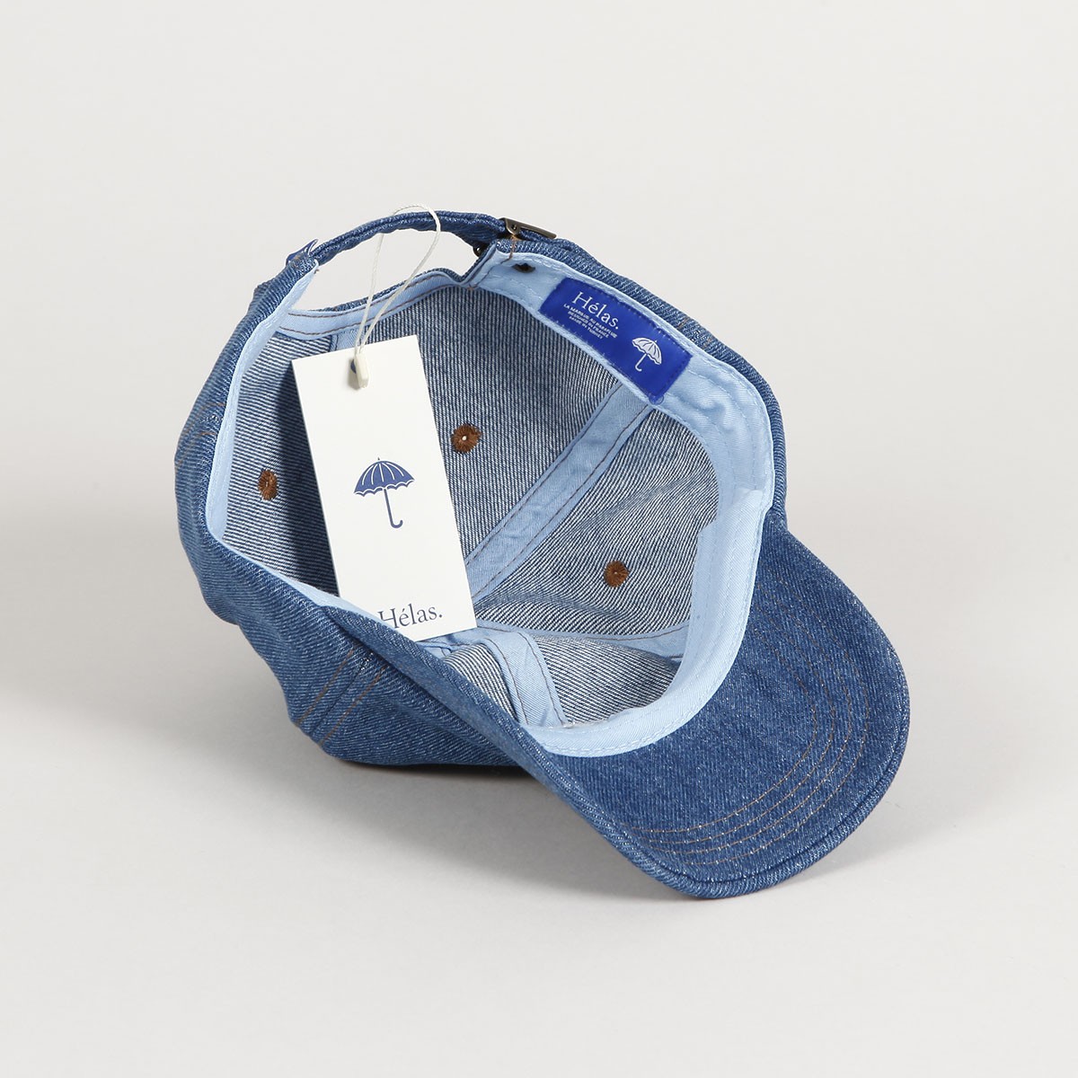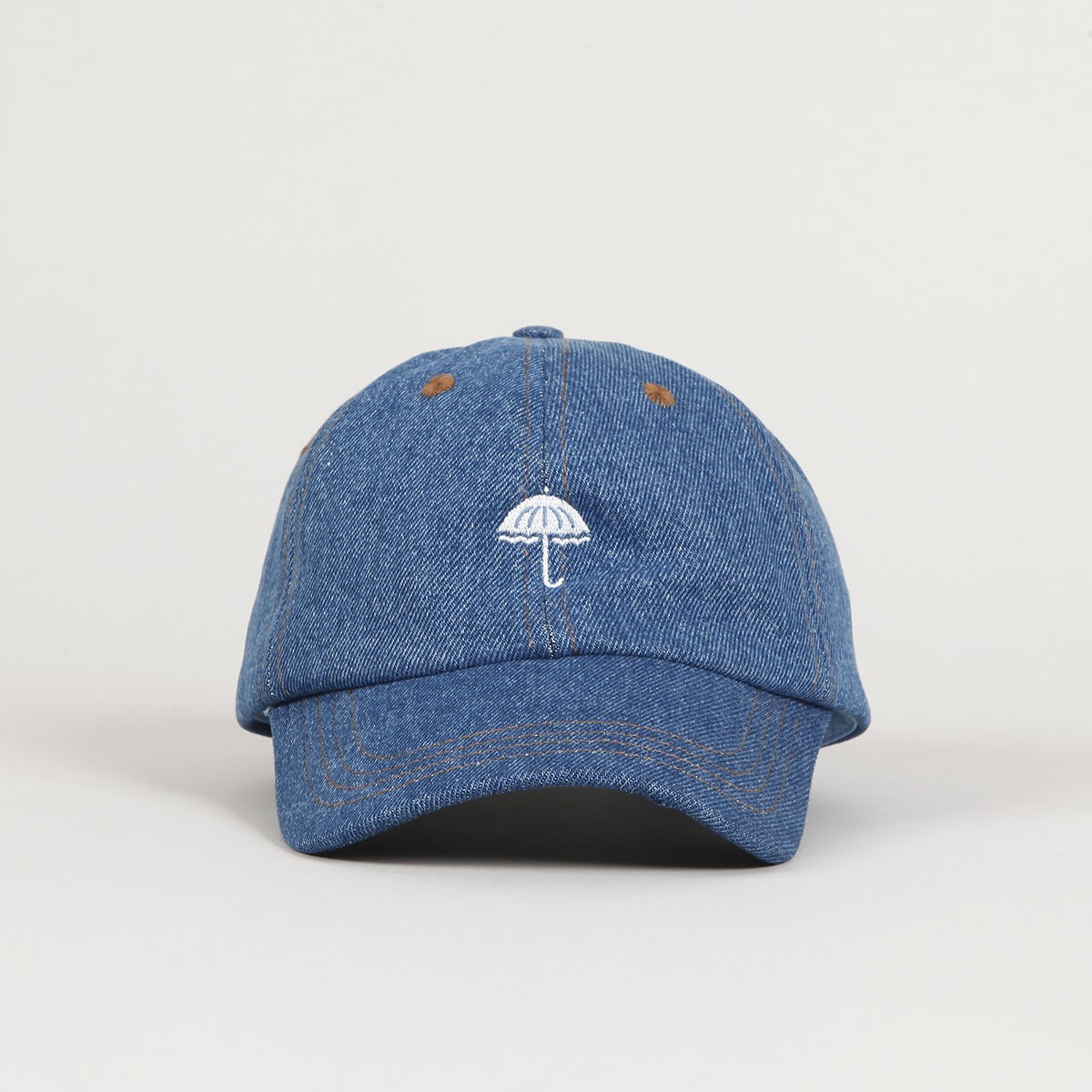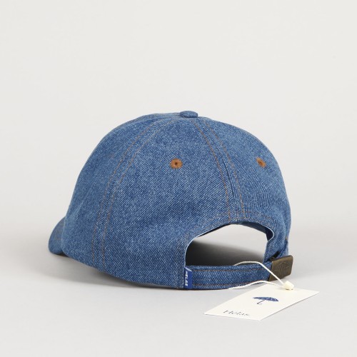 Light blue denim Hélas cap with a slightly curved peak and an embroidered white umbrella on the forehead. Classic six-panel construction with ventilation eyelets on each panel. Fabric strap with metal buckle for size adjustment with a subtle flag on the back. Made of 100% cotton. The collection brings a nostalgic trip back to the time when Powerpoint and Windows Paint conquered the digital scene, which also reflected the aesthetic and visual side of the late 80s and early 90s. Hélas focused on fun and optimistic times of bright colors, fun prints, music, Fresh Prince and funk.