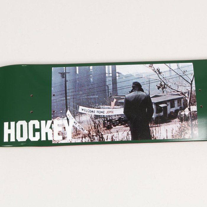 Skateboard deck from Jason Dilla and AVE - Hockey Skateboards. Pro model of rider John Fitzgerald called Welcome Home Deck, graphic of a photo of John looking at a house with the inscription Hockey. Size 8.25 inches, length 31.79 inches and wheel base 14.12 inches. The top colored side of the board may differ from the photo. Free grip with each board.
