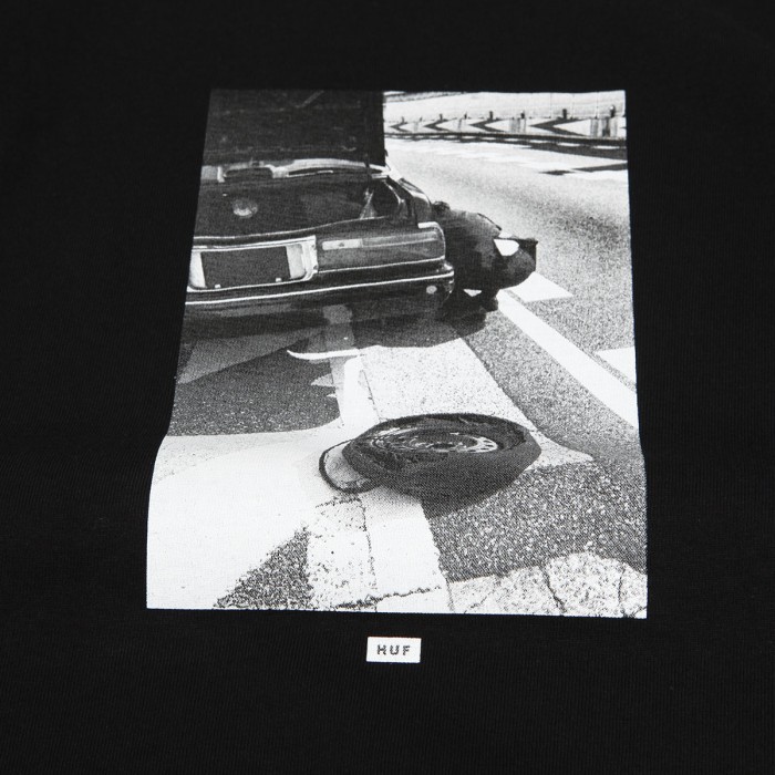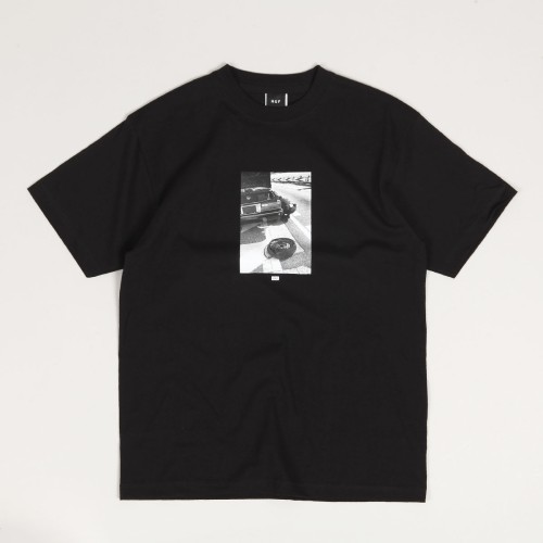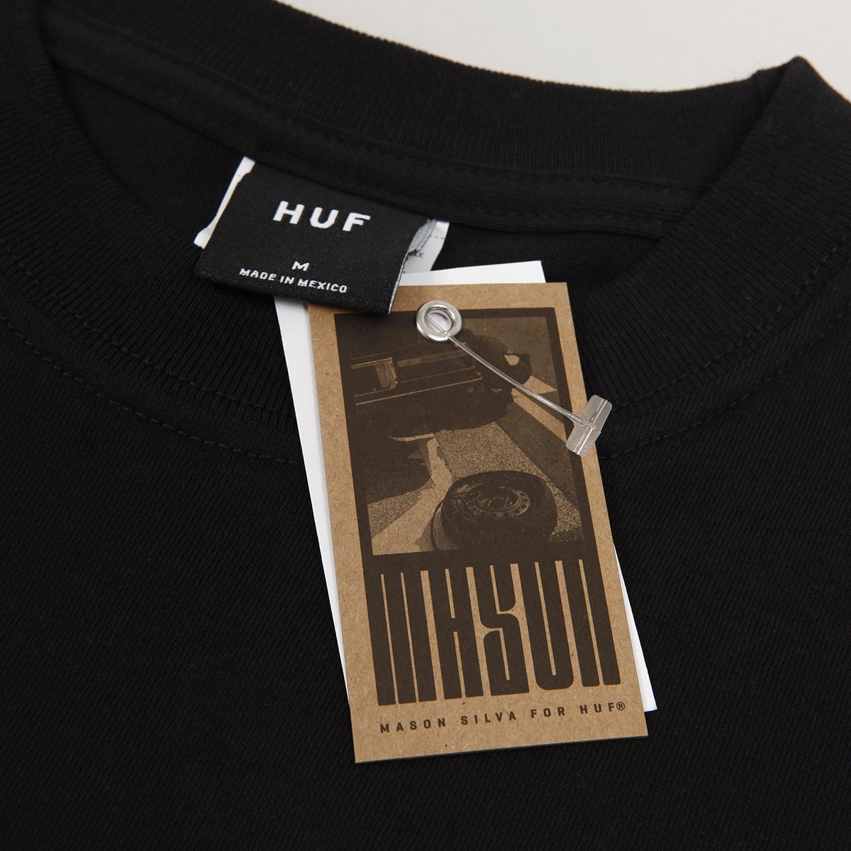 HUF Mason Tee in black . Large graphic of a black and white photo of a bike change on the chest. Small HUF logo in contrasting white below the graphic . Design created by HUF team rider Mason Silva. Material is 100% cotton.
