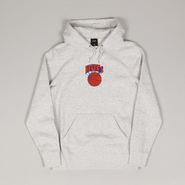HUF Eastern Hoodie in brindle grey has a contrasting HUF logo with a basketball embroidered on the chest. Adjustable hood and large front hand pocket. Material 80% cotton, 20% polyester, 330 gsm, fleece lining.